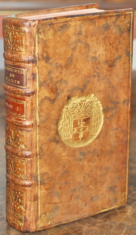 10 vol. in-12 de : tome I, XLIV-466 pp., 8 planches ; II. (4)-496 pp., 17 planches ; III. (4)-501 pp., avec 12 planches ; IV. (4)-482 pp., 19 planches ; V. (4)-487 pp., 10 planches ; VI. (4)-445 pp., 9 planches ; VII. (4)-422 pp., 7 planches ; VIII. (4)-466 pp., puis pp. chiffrées (345)-(340), 8 planches ; IX. [Environs de Paris]. VIII-536 pp., 4 planches ; X. Contenant la liste des rues, &c., la table générale des matières (4)-564 pp., veau marbré, dos orné à nerfs, filet doré d’encadrement sur les plats, fleurs de lys dorées en écoinçon, armes frappées au centre, tranches rouges (reliure de l’époque).