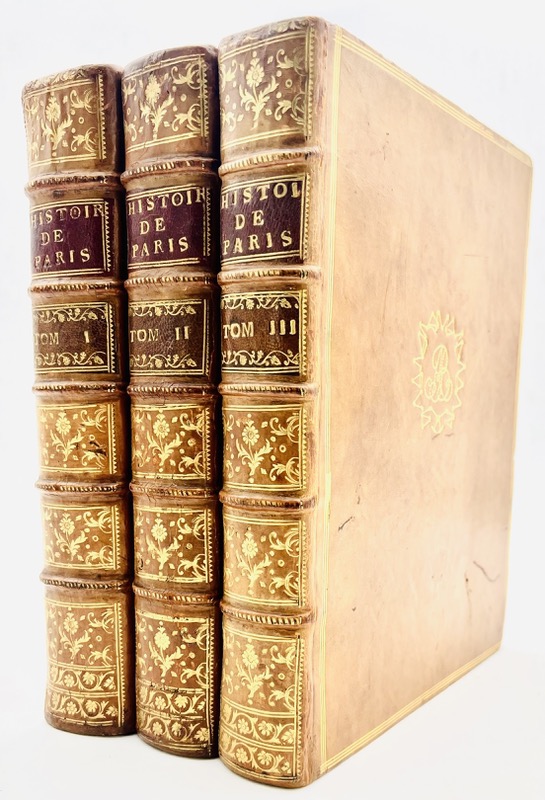 Première et seule édition du plus bel ouvrage du XVIIIe siècle consacré à Paris ; il fut publié simultanément au format in-8 et au format in-4. 3 titres gravés, 2 frontispices, 3 en-têtes, 10 planches d’allégories et de portraits, et 78 jolies vues de Paris, le tout gravé par Martinet Commencé par l’avocat Edme Béguillet, l’ouvrage fut achevé par l’abbé Jean-Charles Poncelin. Sous forme d’articles, il présente la ville-capitale dans son ensemble, c’est-à-dire sa situation géographique, sa population, ses monuments publics et autres curiosités, ses églises ou ses halles, mais toujours en apportant des éléments historiques substantiels. Provenance : Louis-Alexandre Barbet (chiffre sur les plats et ex-libris manuscrit). Très bel exemplaire sur grand papier dans une reliure au chiffre AB entouré d’une chaîne d’arpenteur (Louis-Alexandre Barbet).Cohen – De Ricci, 692 ; Lacombe, 931.