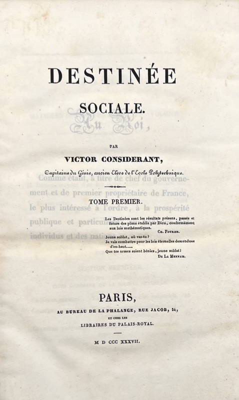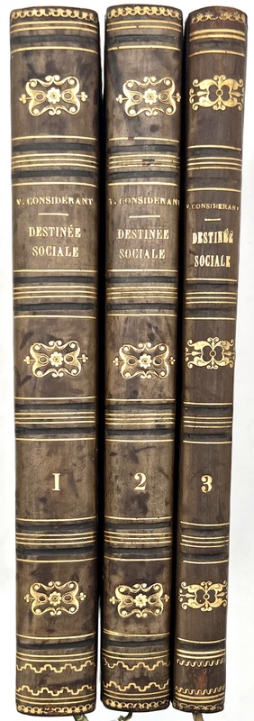 Édition originale des trois volumes. Frontispice gravé. Très rare. Dommanget, Victor Considérant : « Il n’y a pas dans toute la riche littérature phalanstérienne un ouvrage de propagande qui puisse soutenir la comparaison avec Destinée sociale. […] Comme ordre, logique, méthode, clarté, attrait, Destinée sociale répond à tout de ce qu’on peut exiger d’un ouvrage de ce genre ». Principal ouvrage de Victor Considérant ici complet de ses trois tomes. L’ouvrage forme le premier grand traité phalanstérien de Victor Considerant, qui devait succéder à Fourier à la tête de l’École sociétaire en 1837, et il demeure son meilleur exposé. Provenance : Jacques Duclos (1898-1875), l’un des trois principaux dirigeants du Parti communiste français durant près de cinquante ans en compagnie de Maurice Thorez et de Benoît Frachon (ex-libris à la faucille et au marteau). Bel exemplaire, rare en reliure de l’époque. Remise en vente du tome I (daté 1835) avec nouvelle page de titre datée 1837. Del Bo, p. 10 ; Kress, C.3706.