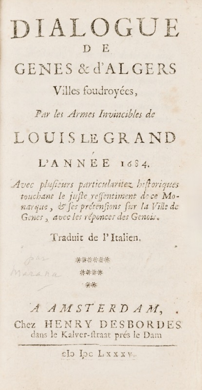 Dialogue de Genes, & d'Algers villes foudroyées, par les armes invincibles de Louis le Grand l'année 1684. Avec plusieurs particularitez historiques touchant le juste ressentiment de ce monarque, & ses pretentions sur la ville de Genes, avec les réponses des Genois. Traduit de l'italien.