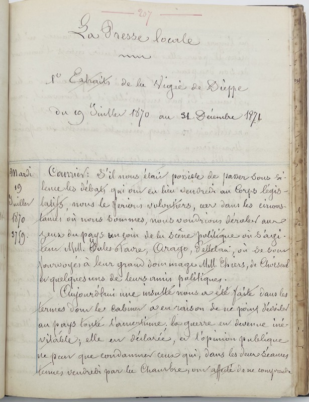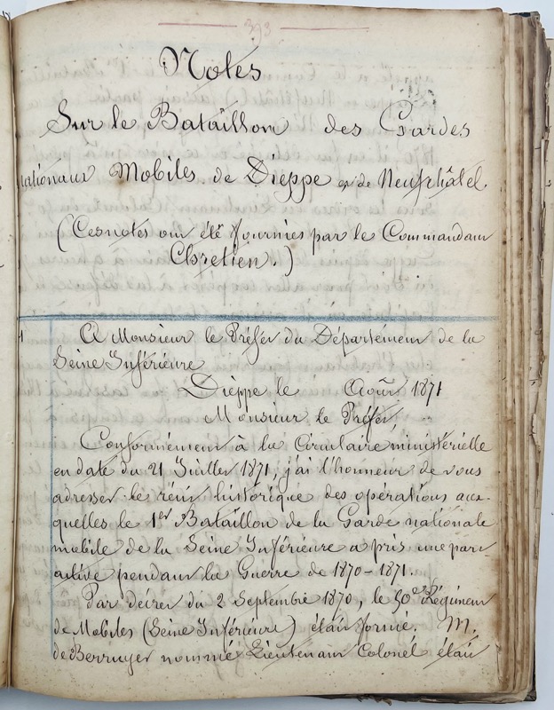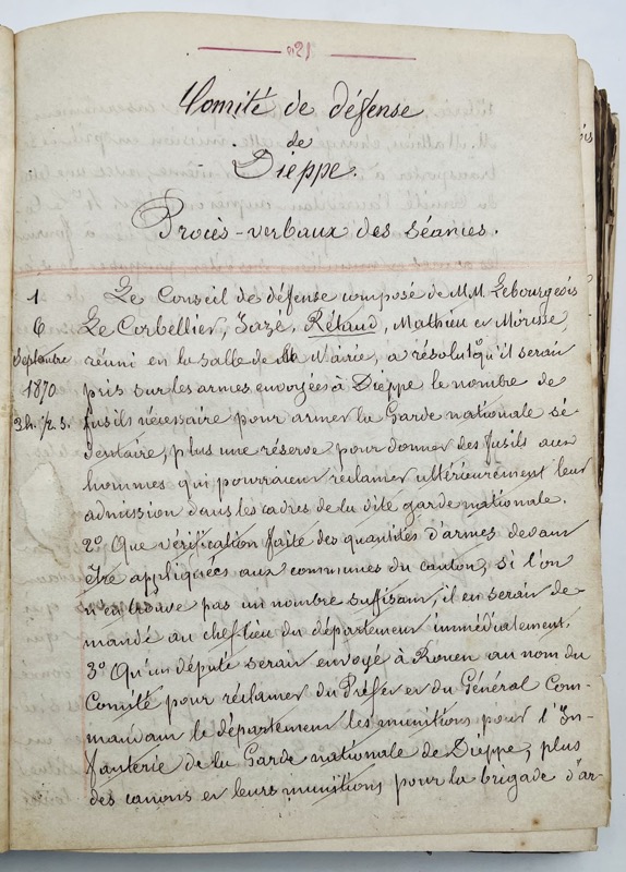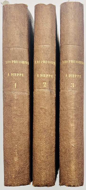 Important recueil de pièces copiées et imprimées, dédié à la guerre franco-prussienne de 1870 et ses conséquences dans la ville de Dieppe en Normandie, de la mobilisation de la Garde Nationale à l’occupation des Prussiens. « Pour couper toute communication entre l’armée du Nord et l’armée du Havre, le général de Manteuffel , dès son arrivée à Rouen, avait décidé une expédition contre le littoral. Deux bataillons d’infanterie, une brigade de cavalerie, cuirassiers et uhlans, avec une batterie à cheval, furent réunis le 7 décembre 1870 à Clères sous les ordres du général-major comte de Dohna. Le 8 décembre, ce détachement marcha sur Omonville et, le 9 décembre, sur Dieppe où il entra sans résistance. Après avoir brisé les fusils, encloué les canons de marine trouvés au château et dans les batteries de côtes, coupé les fils du télégraphe et enlevé les appareils, il détruisit les postes sémaphoriques et rasa les mâts de signaux, sans oublier de faire de nombreuses réquisitions, surtout à la Manufacture des tabacs; le lendemain, le général de Dohna se retira sur Auffay. L’occupation d’un de nos ports de mer, connue le 10 décembre à Versailles, fut aussitôt annoncée en Allemagne et célébrée par la presse de ce pays à l’égal d’un important succès. Nos journaux racontèrent qu’à la vue de la mer, les cavaliers du comte de Dohna coche verte s’étaient découverts et avaient poussé trois hurrahs pour leur roi et leur patrie. On comprend l’émotion de ces soldats quelques mois auparavant, ils n’espéraient guère franchir le Rhin allemand et, après des succès inouïs, ils se voyaient tout à coup transportés jusque sur les rivages de la Manche. Le 8 décembre, Dieppe vit ses premiers jours sous occupation prussienne. Les fantassins sont répartis entre le château et les habitations de la ville, les uhlans prussiens patrouillent dans la ville et l’artillerie est postée sur les falaises » (Louis-Paul Rolin, La Guerre dans l’Ouest campagne de 1870-1871, Paris, Plon, 1874). Vol. 1 (copies manuscrites). Procès-verbaux des séances du Comité de défense de Dieppe du 6 septembre au 2 décembre 1870 « dernière séance (…) Il n’y a plus eu de séances du Comité de défense, les Prussiens étant dans les environs. Le 5, ils entraient à Rouen et le 9 à Dieppe ») ; examen des armes transformées, observations sur le tir à obus ou à boulets, mobilisation « outre les casernes, on n’a trouvé que l’établissement des Bains où l’on peut loger les mobilisés (…) 2000 mobilisés à Dieppe » ; « Comité de Défense de Dieppe (Seine Inférieure) : Composition de ce conseil – Armement – Défense Gardes nationales sédentaire et mobilisée – Compagnies de Marche et de Marins – Registres des consignes et correspondances, accusés de réception etc. » ; « Dépêches télégraphiques ayant un caractère tout local » ; « Notes sur le bataillon des gardes nationaux mobiles de Dieppe et de Neufchâtel (ces notes ont été fournies par le commandant Chrétien) » ; « Guerre de 1870-1871. Notice sur le concours prêté dans cette guerre par la Compagnie de marche du bataillon de la Garde nationale de Dieppe. Par Lelong Sergent major de la compagnie (imprimerie d’Émile Delevoye) » ; « Invasion prussienne à Dieppe en commune. Anecdotes. Vols pillages, blessures, etc. Rapports » (pp. 465-490) ; « État des vols et pillages des Prussiens » (p. 524) ; « Extraits du Journal La Gironde n°du 18 février 1871 » (p. 543) ; « Liste nominative de personnes réfugiées à Dieppe pendant l’invasion prussienne (800). Cette liste a été dressée dans le courant du mois d’octobre 1870 sur renseignements recueillis par le commissaire de police » (p. 569) ; « Éphémérides pour servir à l’intelligence de l’ouvrage intitulé : Dieppe en 1870-1871 par L. Lasne » (p. 604) ; « Extraits de l’Éclaireur de Dieppe (Journal de l’opposition né le 20 mai 1870, mort le août même année) Rédacteur en chef . Ed. Dupin dit St Sauveur » (p. 623). Vol. 2 (copies manuscrites). Dépêches télégraphiques. Guerre et Politique. 1870-1871 (n°1-341) Paris 21 mai 1870 – Journal officiel 30 janvier 1871 ; La Presse locale. 1. Extraits de la Vigie de Dieppe du 19 juillet 1870 au 31 décembre 1871 ; Extraits de la ligne directe du n°1 du 18 juillet au 4 décembre 1870 ; Dépêches télégraphiques diverses. Vol. 3 (imprimés et copies manuscrites). Protestation du Corps Municipal de Rouen, aux journaux du Havre et de l’Eure. Rouen, le 20 décembre 1870. 4 pp. (texte imprimé) ; Conseil municipal de la Ville de Rouen. Procès-verbaux des séances des 4 et 5 décembre 1870. (texte imprimé) ; Duval (Edgard-Raoul). Comment Rouen n’a pas été défendu. (Rouen, Lapierre, 1870, copie manuscrite pp. 51-124). Edgard-Raoul Duval (1832-1887) avocat général à Angers, à Bordeaux et à Rouen, député de la Seine-Inférieure de 1876 à 1877 et de 1884 à 1887 ; Estancelin (Louis). La vérité sur les événements de Rouen. Rapport au conseil général de la Seine-Inférieure. Rouen, A. Le Brument, 1871. XVI-42 pp. Pièces justificatives (texte imprimé, exemplaire annoté). Extrait du budget départemental au 1er septembre 1871 etc. ; Insurrection de Paris : Dépêches officielles (copie manuscrite), Dépêches officielles. 21 mars 1871 n°1, Liste comprenant les noms (421) des individus connus pour avoir fait partie de la Commune et des comités centraux ou pour avoir exercé des fonctions et signé des articles dans le journaux de la Commune pendant la période insurrectionnelle, Insurrections de Paris, Lyon, Saint Étienne. Condamnés par contumace : liste des noms, Individus suspects, évadés, recherchés, etc. à arrêter ou signaler. Circulaires concernant les suspects de la Commune ; Liste des journaux, brochures et publications (280) soit à l’étranger soit en France dont la distribution ou l