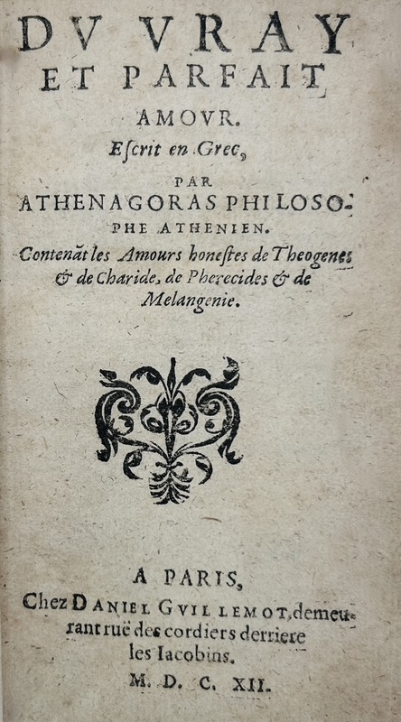 Deuxième édition publiée treize ans après l’originale (1599). Sous forme de dialogues amoureux, cet ouvrage, présenté comme la traduction d’un manuscrit d’Athenagoras, donne un traité fort curieux pour arriver au but secret de la philosophie hermétique. Attribué au savant commentateur de Vitruve, Philander, on se retourna bien vite vers le traducteur qui signa l’épître dédicatoire au Cardinal d’Armagnac pour démasquer l’auteur Martin Fumée, sieur de Genillé, gentilhomme de la Chambre du duc d’Anjou (1540-1590). Collin de Plancy lui consacra un article dans son Dictionnaire Infernal : « Fumée trouva le moyen de le faire rechercher des adeptes par diverses allusions et surtout par un passage curieux, où sous le voile de l’allégorie, il peint la confection du grand oeuvre ». Bel exemplaire. Note bibliographique manuscrite rédigée en anglais (XIXe) sur la garde supérieure relative à la supercherie du roman de Martin Fumée. Petites rousseurs. Caillet, II, 4253 ; Gay, II, 46 ; Lenglet Dufresnoy, II p. 106 ; Nourry, 193