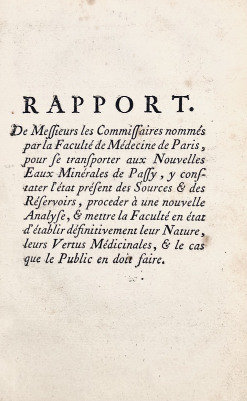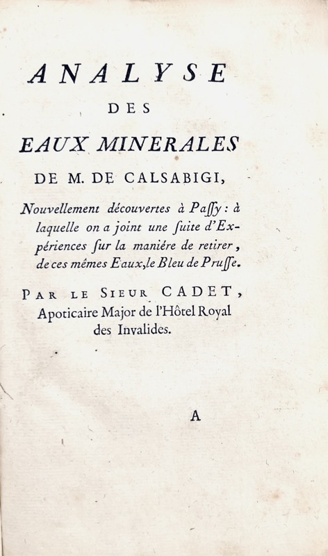 ![[Eaux de Passy]. CADET DE GASSICOURT (Louis-Claude). Analyse des eaux minerales de M. de Calsabigi, nouvellement découvertes à Passy : à laquelle on a joint une suite d'expériences sur la maniére de retirer, de ces mêmes eaux, le bleu de Prusse. Par le sieur Cadet, apoticaire major de l'Hôtel royal des invalides. Sans lieu, (1755). In-8 de 37 pp. Édition originale. VENEL (Gabriel-François) & BAYEN (Pierre). Examen chimique d'une eau minérale nouvellement découverte à Passy dans la maison de monsieur & de madame de Calsabigi exécuté en conséquence de l'ordonnance de M. le premier médecin, du 23 avril 1755, qui commet à cet effet les Srs. Venel & Bayen, préposés par le Roi à l'analyse des eaux minérales du royaume. S.l., 1755. In-8 de 32 pp. Édition originale. ROUELLE (Guillaume-François) & CADET DE GASSICOURT (Louis-Claude). Analyses d'une eau minérale faites par MM. Rouelle, de l'Académie des Sciences, et Cadet, apothicaire major de l'Hôtel Royal des Invalides. S.l., (1755). In-8 de 29 pp. Édition originale. Rare plaquette qui suit les analyses de Rouelle et Cadet sur les eaux de Passy. L'objet de cette étude est de montrer que les eaux trouvées chez Mme Belami, voisine des Calasabigi sont au moins aussi bonnes. DEMACHY (Jean François). Examen physique et chimique d'une eau minérale trouvée chez M. de Calsabigi à Passy ; comparée aux eaux du même Côteau, connues sous le nom des nouvelles eaux minérales de Madame Belami. S.l, (1756). In-8 de 45 pp. Édition originale. Rapport. De messieurs les commissaires nommés par la faculté de médecine de Paris, pour se transporter aux nouvelles eaux minérales de Passy, y constater l'état présent des sources & des réservoirs, proceder à une nouvelle analyse, & mettre la faculté en état d'établir définitivement leur nature, leurs vertus médicinales, & le cas que le public en doit. Paris, de l'imprimerie de la Veuve Quillau, imprimeur de la faculté de Médecine, 1759. In-8 broché de 32 pp. Édition originale. Rapport fait par François Mery, Jean-Baptiste Louis Chomel, Louis-Alexandre Vieillard, Louis Jean-Baptiste Cosnier, Jacques-François Latier et Jean-Baptiste François de La Rivière.](https://bonnefoi-livres-anciens.com/wp-content/uploads/2025/08/43447_1.jpg)
