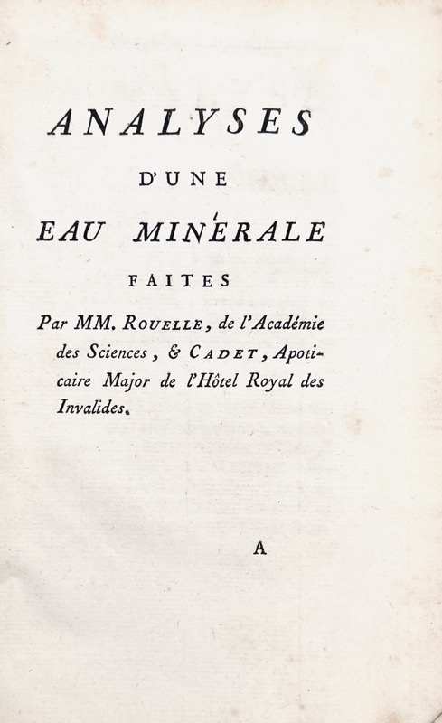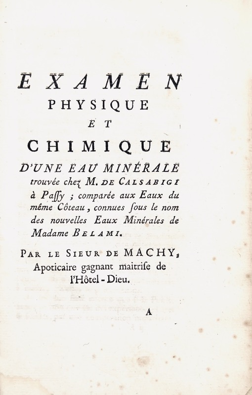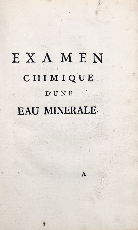 ![[Eaux de Passy]. CADET DE GASSICOURT (Louis-Claude). Analyse des eaux minerales de M. de Calsabigi, nouvellement découvertes à Passy : à laquelle on a joint une suite d'expériences sur la maniére de retirer, de ces mêmes eaux, le bleu de Prusse. Par le sieur Cadet, apoticaire major de l'Hôtel royal des invalides. Sans lieu, (1755). In-8 de 37 pp. Édition originale. VENEL (Gabriel-François) & BAYEN (Pierre). Examen chimique d'une eau minérale nouvellement découverte à Passy dans la maison de monsieur & de madame de Calsabigi exécuté en conséquence de l'ordonnance de M. le premier médecin, du 23 avril 1755, qui commet à cet effet les Srs. Venel & Bayen, préposés par le Roi à l'analyse des eaux minérales du royaume. S.l., 1755. In-8 de 32 pp. Édition originale. ROUELLE (Guillaume-François) & CADET DE GASSICOURT (Louis-Claude). Analyses d'une eau minérale faites par MM. Rouelle, de l'Académie des Sciences, et Cadet, apothicaire major de l'Hôtel Royal des Invalides. S.l., (1755). In-8 de 29 pp. Édition originale. Rare plaquette qui suit les analyses de Rouelle et Cadet sur les eaux de Passy. L'objet de cette étude est de montrer que les eaux trouvées chez Mme Belami, voisine des Calasabigi sont au moins aussi bonnes. DEMACHY (Jean François). Examen physique et chimique d'une eau minérale trouvée chez M. de Calsabigi à Passy ; comparée aux eaux du même Côteau, connues sous le nom des nouvelles eaux minérales de Madame Belami. S.l, (1756). In-8 de 45 pp. Édition originale. Rapport. De messieurs les commissaires nommés par la faculté de médecine de Paris, pour se transporter aux nouvelles eaux minérales de Passy, y constater l'état présent des sources & des réservoirs, proceder à une nouvelle analyse, & mettre la faculté en état d'établir définitivement leur nature, leurs vertus médicinales, & le cas que le public en doit. Paris, de l'imprimerie de la Veuve Quillau, imprimeur de la faculté de Médecine, 1759. In-8 broché de 32 pp. Édition originale. Rapport fait par François Mery, Jean-Baptiste Louis Chomel, Louis-Alexandre Vieillard, Louis Jean-Baptiste Cosnier, Jacques-François Latier et Jean-Baptiste François de La Rivière. – Image 4](https://bonnefoi-livres-anciens.com/wp-content/uploads/2025/08/43447_4.jpg)