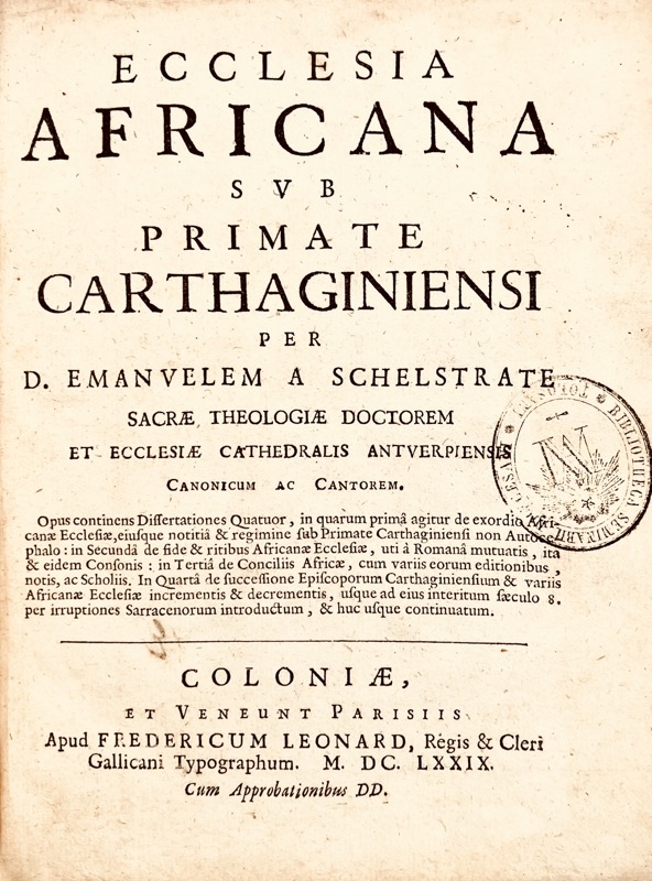 Édition originale. « L’un des plus zélés défenseurs de la cour de Rome dont le but dans cet ouvrage est de prouver que l’Église d’Afrique reconnaissait la souveraineté du pape » (Michaud). Théologien savant, le chanoine de la cathédrale d’Anvers Emmanuel Schelstrate (1645-1692) fut nommé par le pape Innocent XI préfet de la Bibliothèque vaticane (1683-1692). Portrait gravé en regard de la dédicace du cardinal Girolamo Casanate (1620-1700) successeur en 1693 de Schelstrate à la bibliothèque du Vatican, préfet de la Congrégation de l’Index, et fondateur de la Biblioteca Casanetense. Notice biographique manuscrite ancienne en regard du titre, cachet ancien de la bibliothèque du grand séminaire de Toulouse (titre). Discrètes restaurations. Très bon exemplaire. Gay, 473.