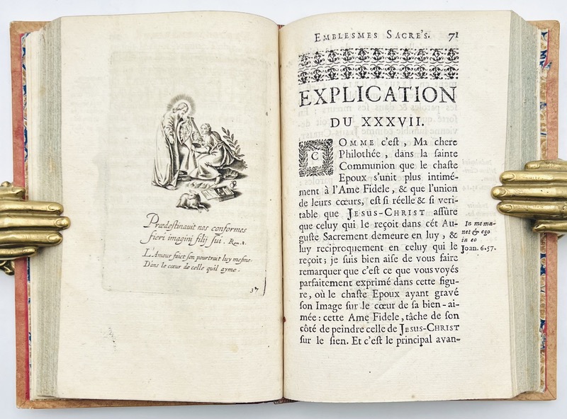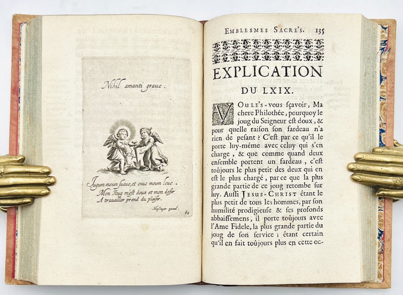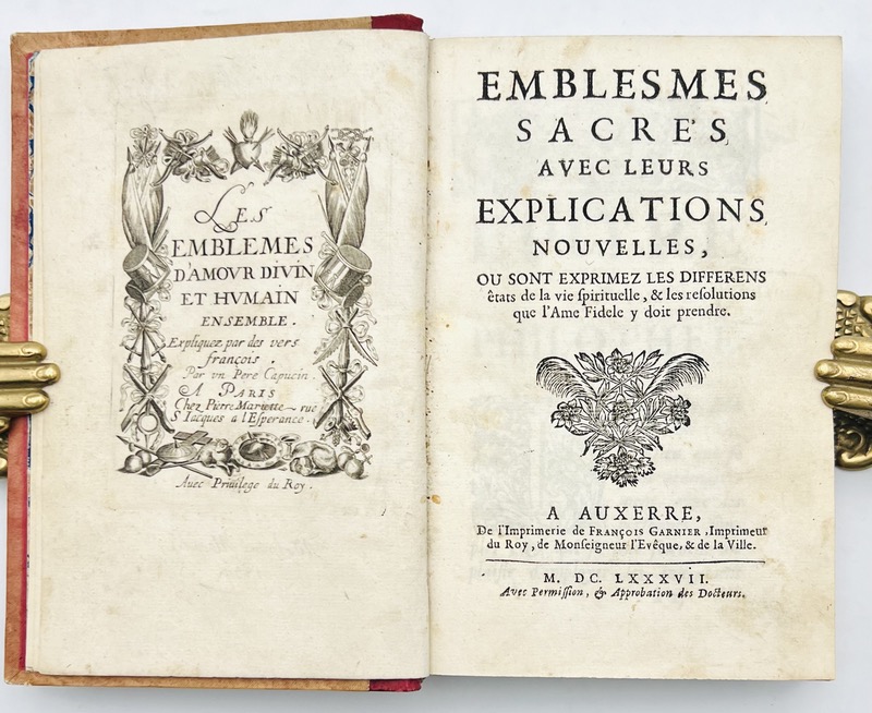 Dernière édition du XVIIe siècle des Emblèmes d’Amour divin publiée à Auxerre sous un nouveau titre avec la description inédite de Claude Brunet. La suite de gravures fut publiée une première fois sans texte en 1631 par Jean Messager puis remise en vente vers 1650 par Pierre Mariette : titre-frontispice repris de l’édition Mariette et 119 planches illustrées de deux angelots figurant l’amour divin et l’amour humain ou profane, le tout finement gravé en taille douce. Chaque planche comporte un verset en latin suivi d’un distique en français. Ex-libris manuscrits : ex libris Ordini valeil laubinne ; Sr Marie Angelique ; Adolphe Marlet 1839 (ce dernier avec son cachet). De pâles rousseurs mais bon exemplaire. Landwehr, Emblem & Fable Books, 274.