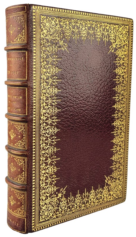 In-12 de (4)-386 pp., maroquin prune, large décor doré à petits fers sur les plats dans un encadrement de frises roulettes et dentelles traces de fermoirs, dos orné à nerfs, tranches dorées sur marbrure, filets et frises intérieurs (Bretault).