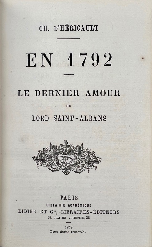 Édition originale. Exemplaire sur papier de Hollande. Roman historique autour de la journée du 10 août 1792 de l’historien et écrivain Charles d’Héricault (1823-1899), auteur du Premier amour de Lord Saint-Albans la même année (1879), de Les extravagances du hasard nouvelle parisienne et fantasque (1864), La Révolution 1789-1882 etc. Superbe reliure en maroquin à dentelle signée Joseph Bretault (1856-1903) relieur parisien (Flety, 33). Dos légèrement passé.