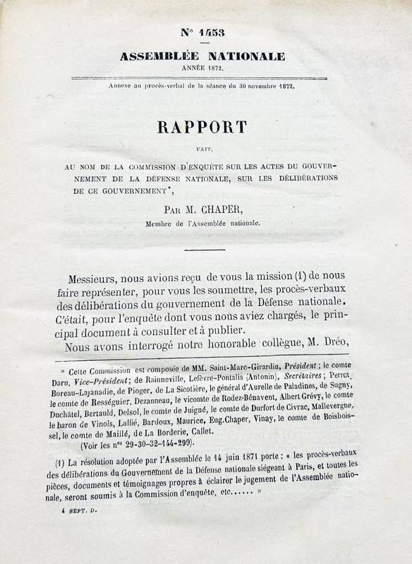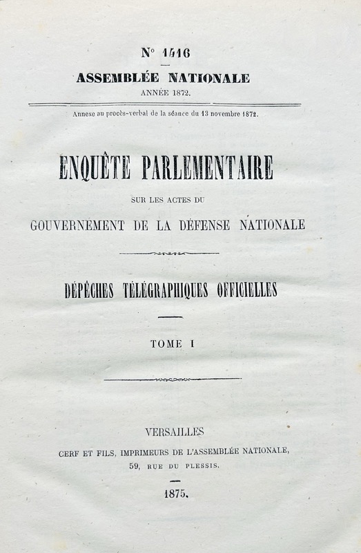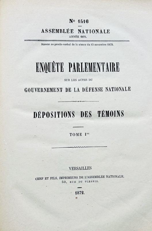 Collection complète rare de cette enquête monumentale sur les événements qui se sont déroulés en France depuis la chute du Second Empire, la guerre Franco-Allemande, le rôle de l’Association Internationale des Travailleurs tant à Paris qu’en province. Cette série, publiée en livraison constitue l’ensemble de documents le plus complet sur le gouvernement de la Défense nationale. Dépositions des Témoins ; Rapports ; Dépêches télégraphiques officielles. Bel exemplaire. Le Quillec, 870.