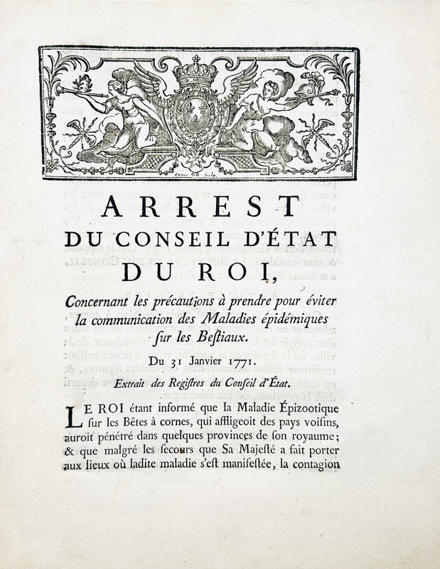 [Épizootie]. BERTIN (Henri Léonard Jean Baptiste). Arrêt du Conseil du roi, concernant les précautions à prendre pour éviter la communication des maladies épidémique sur les bestiaux. Du 31 janvier 1771.