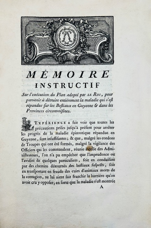 Édition originale. En 1774, la peste bovine sévissait en Europe occidentale depuis plus de dix ans. Elle était venue des plaines hongroises avec les armées de la Guerre de Sept Ans. Au mois de mai, elle fit son apparition à la surprise générale dans le sud-ouest du royaume, sans que la moindre contamination terrestre ait pu être évoquée. Le créateur et directeur des écoles vétérinaires, Claude Bourgelat, qui en 1765 créa le mot épizootie conseille avec clairvoyance les ministres Bertin et Turgot. Ils sollicitèrent l’aide de l’Académie des Sciences qui désigna comme expert Félix Vicq d’Azyr (1748-1794), spécialiste de l’anatomie animale et humaine. Sur ses indications, Turgot adressa le 4 février 1775, aux gouverneurs, intendants et autres administrateurs, un mémoire où, en raison de la persistance de l’épizootie, il ordonne de sacrifier impitoyablement tout ce qui est malade. Un ensemble cohérent de mesures sanitaires fut institué pour la première fois : abattage indemnisé à raison du tiers de la valeur des animaux, désinfection, recensement et isolement. (François Vallat, Félix Vicq d’Azyr et l’épizootie de 1774 – 1776). Bull.Soc.Hist.Méd.Sci.Vét., 2007, 7 : 127-140 ).
