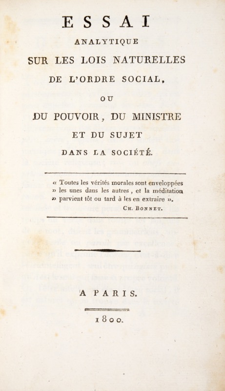 Édition originale rare. Avec Joseph de Maistre, Louis de Bonald (1754-1840) fut le principal théoricien de la théocratie, théorie selon laquelle tout pouvoir émane de Dieu et ne peut se réaliser que sous la monarchie. « Penseur et homme politique contre-révolutionnaire – on dirait aujourd’hui ultraréactionnaire –, Louis de Bonald est une figure de proue de la pensée traditionaliste et conservatrice française. Royaliste et théocrate, nostalgique de l’Ancien Régime, il raisonnait dans et pour une société traditionnelle, résolument adversaire des Lumières, de la modernité et des orientations libérales (…) Bonald pense que la société s’impose à l’individu. Pour lui, la famille se présente comme une petite société politique, hiérarchique et exemplaire. Cette cellule domestique, qui ne doit pas être dissoute car elle est dite naturelle et protectrice, est une unité constitutive du lien politique, la seule base possible de la société. Le père de famille, investi, comme le roi, par la présence divine, est socle de la société et de l’Etat (L. Damon). Très bon exemplaire. Quelques rousseurs, pâle mouillure marginale.