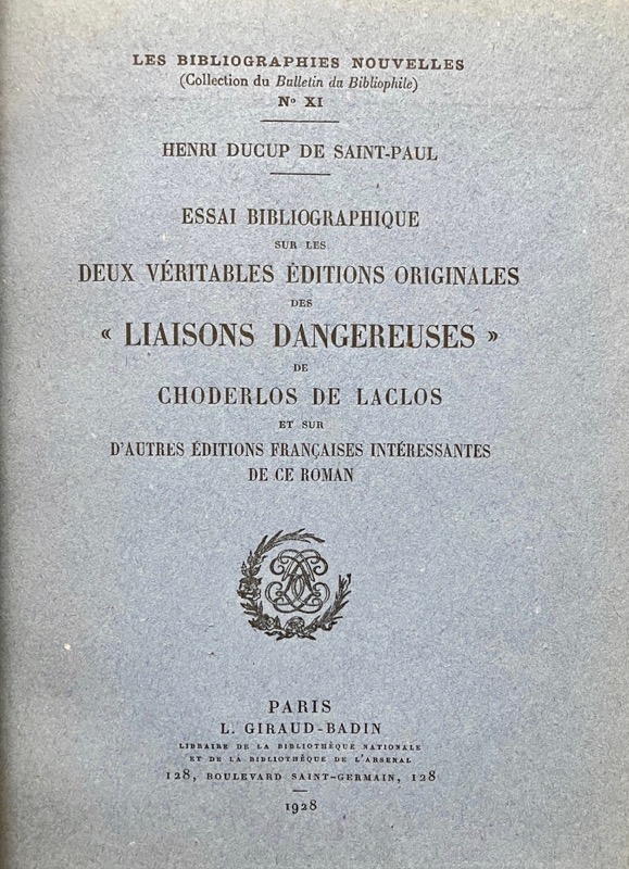 Essai bibliographique sur les deux véritables éditions originales des ’’Liaisons dangereuses’’ de Choderlos de Laclos et sur d’autres éditions françaises intéressantes de ce roman.