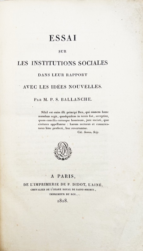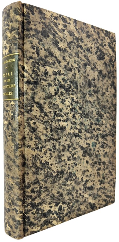 Edition originale. Analyse et remèdes par le philosophe Pierre-Simon Ballanche au malaise qu’il discerne dans la société française de la Restauration, dix ans avant la publication des Essais de Palingénésie Sociale. Besoin d’institutions nouvelles ; Du trouble des esprits au sujet du sentiment religieux ; Nouvelles preuves que la société a été imposée à l’homme ; Conséquences de l’émancipation de la pensée dans la sphère des idées religieuses… de la littérature et des arts… des idées politiques, etc. Bel exemplaire.