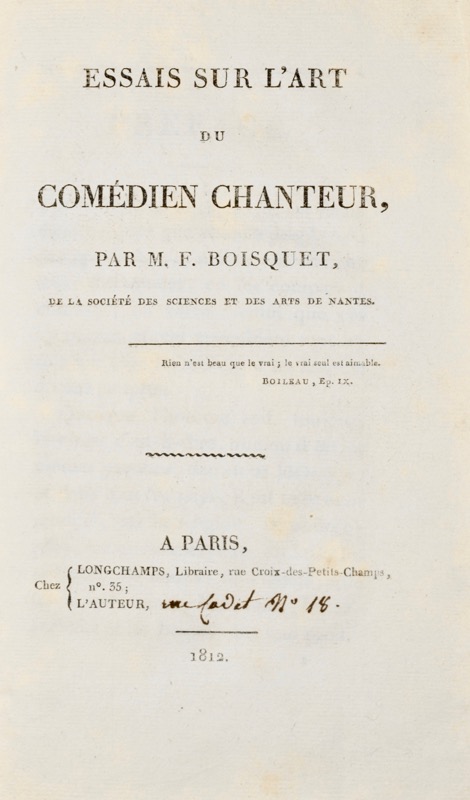 Édition originale. « Pour être grand, dans quelque art que ce soit, non seulement il faut en faire une étude profonde, consulter les gens savants, s’occuper constamment des premiers principes ; mais comparer sans cesse ses ouvrages avec les chefs d’oeuvre qui jouissent depuis longtemps de l’estime des vrais connaisseurs ». Membre de la société des Arts et des Sciences de la ville de Nantes où il est né en 1783, François Boisquet s’est fait connaître par ce seul ouvrage où se lisent « quelques observations dont le cadre est neuf » (Fétis). I. De la voix II. Des caractères III. De la pantomime IV. Fonction de la voix à ces matériaux et aux rôles V. De quelques autres parties de l’art du chant. Exemplaire signé par l’auteur en regard du titre. Coins et mors frottés, quelques rousseurs. Fétis, I, 260.