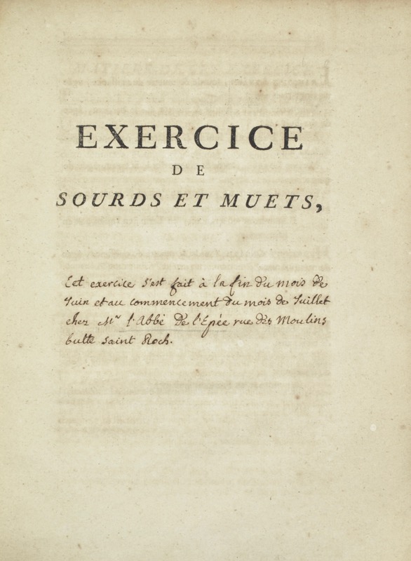 Édition originale de toute rareté. Deuxième « exercice » publié de l’Abbé de l’Épée, « lu et approuvé, ce 14 juin 1772 Marin. Vu l’Approbation, permis d’imprimer, ce 15 juin 1772. De Sartine ». Mention manuscrite sur le titre à l’encre du temps Cet exercice s’est fait à la fin du mois de juin et au commencement du mois de Juillet, chez Mr l’Abbe de l’Epée, rue des Moulins, Butte Saint Roch. Ébauche vers la méthode élaborée par Charles-Michel de L’Épée (1712-1789) qui allait aboutir en 1774 au Recueil des exercices soutenus par les sourds et muets, pendant les années 1771, 1772, 1773 et 1774 puis en 1776 à la publication de son ouvrage majeur l’Institution des sourds et muets par la voie des signes méthodiques. Ouvrage qui contient le projet d’une langue universelle « résultat de ses recherches personnelles et de la profonde conviction qui l’habitait : L’instruction des sourds-muets, dit-il, consiste à faire entrer par les yeux, dans leur esprit, ce qui est entré dans le nôtre par les oreilles » (En français dans le texte).