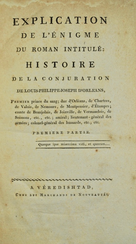 Édition originale. Réfutation de Jacques-Marie Rouzet de Folmon de l’ouvrage de Galard de Montjoye Histoire de la Conjuration de L.P.J. d’Orléans. L’ouvrage imprimé aux frais de la duchesse d’Orléans avant 1814, n’a pas été mis en vente ni même en circulation du vivant de cette princesse ; quelques exemplaires parurent dans les ventes après sa mort survenue en 1822. Rouzet de Folmon (1743-1820), député de la Haute-Garonne à la Convention, obtint la libération de la duchesse de la prison du Luxembourg après le 9 Thermidor et s’occupa de ses finances à la Restauration. « Ouvrage très rare » (Quérard VIII, 258) ; Brunet II, 1136 ; Tourneux, 21572.