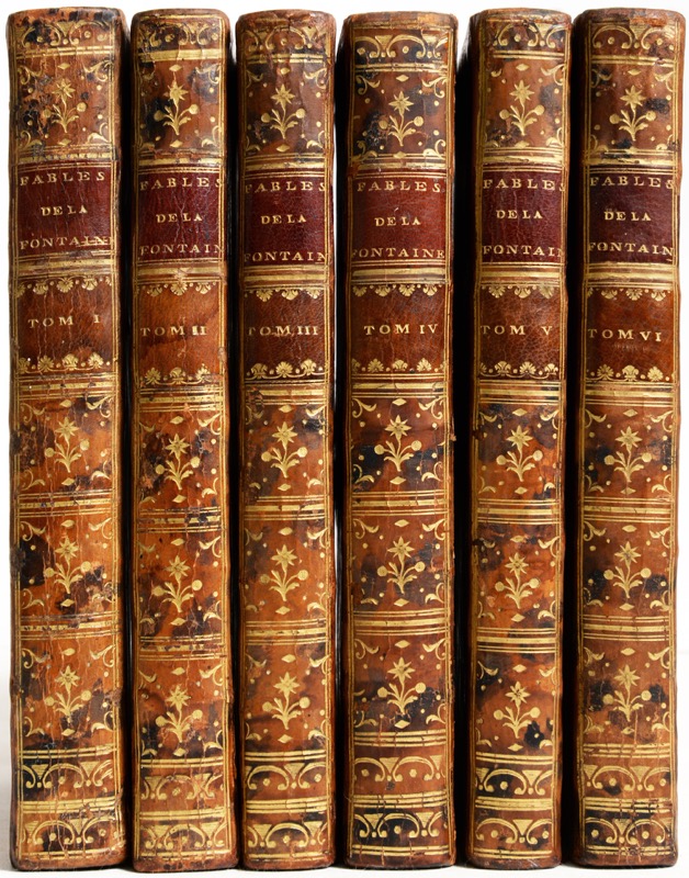 Édition entièrement gravée, en premier tirage, illustrée de 722 compositions gravées par Étienne Fessard dont un frontispice, 6 titres, 243 planches hors textes, 243 vignettes et 226 culs-de-lampe d’après Bardin, Bidault, Caresme, Desrais, Houël, Kobell, Leclère, Leprince, Loutherbourg, Meyer et Monnet ; le texte est gravé par Montulay et Drouët. Bel exemplaire tiré sur grand papier et à grandes marges ; une planche plus courte de marges. Tampon humide BB adossés et couronnés non identifié. Cohen-De Ricci, 551; Després, Les Éditions illustrées des fables de La Fontaine, XXVII ; Rochambeau, Bibliographie des oeuvres de La Fontaine (1911), 101; Tchemerzine, III, 876.