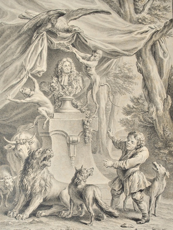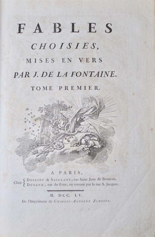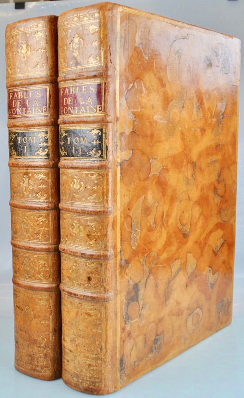 4 tomes en 2 volumes in-folio de : tome I (1755) titre. Livre I, II et III des Fables. Frontispice, Portrait de Oudry et 69 fig. ; II (1755) : Livres IV, V et VI des Fables 68 fig. ; III (1756) : Livres VII, VIII et IX des Fables 68 fig. ; IV (1759) : Livres X, XI et XII des Fables 69 fig. plus l’explication du frontispice et de quelques vignettes et culs-de-lampe contenus dans l’ouvrage, veau porphyre glacé, triple filet doré sur les plats, dos orné à nerfs, pièces de titre en maroquin rouge et de tomaison en maroquin noir, tranches dorées (reliure de l’époque).