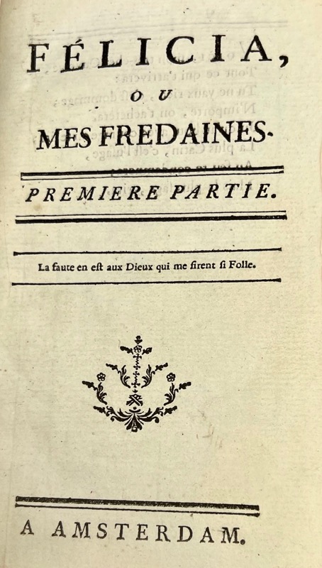 Édition dite d’Amsterdam, publiée sans figure, ornée d’un titre gravé. Cet ouvrage, très souvent réimprimé, au ton très « fôlatre », n’exclut pas les sentiments et les réflexions philosophiques. L’intention de l’auteur, dit-il lui-même « est d’engager les femmes à n’être pas si timide et à trancher les difficultés ; les maris à ne pas se scandaliser aisément, et à savoir prendre leur parti ; les jeunes gens à ne point faire les céladons ». Huitain au verso de la page de titre (tome I) : Voici, mon très-cher Ouvrage, / Tout ce qui t’arrivera : / Tu ne vaux rien, c’est dommage ; / N’importe, on t’achètera. / Jusqu’au bout avec courage on te lira ; / La plus Catin, c’est l’usage, / Au feu te condamnera ; / Mais la plus sage, rira. Très bon exemplaire. Petits accidents sur le plat supérieur. Gay II, p.267 ; Pia 486.