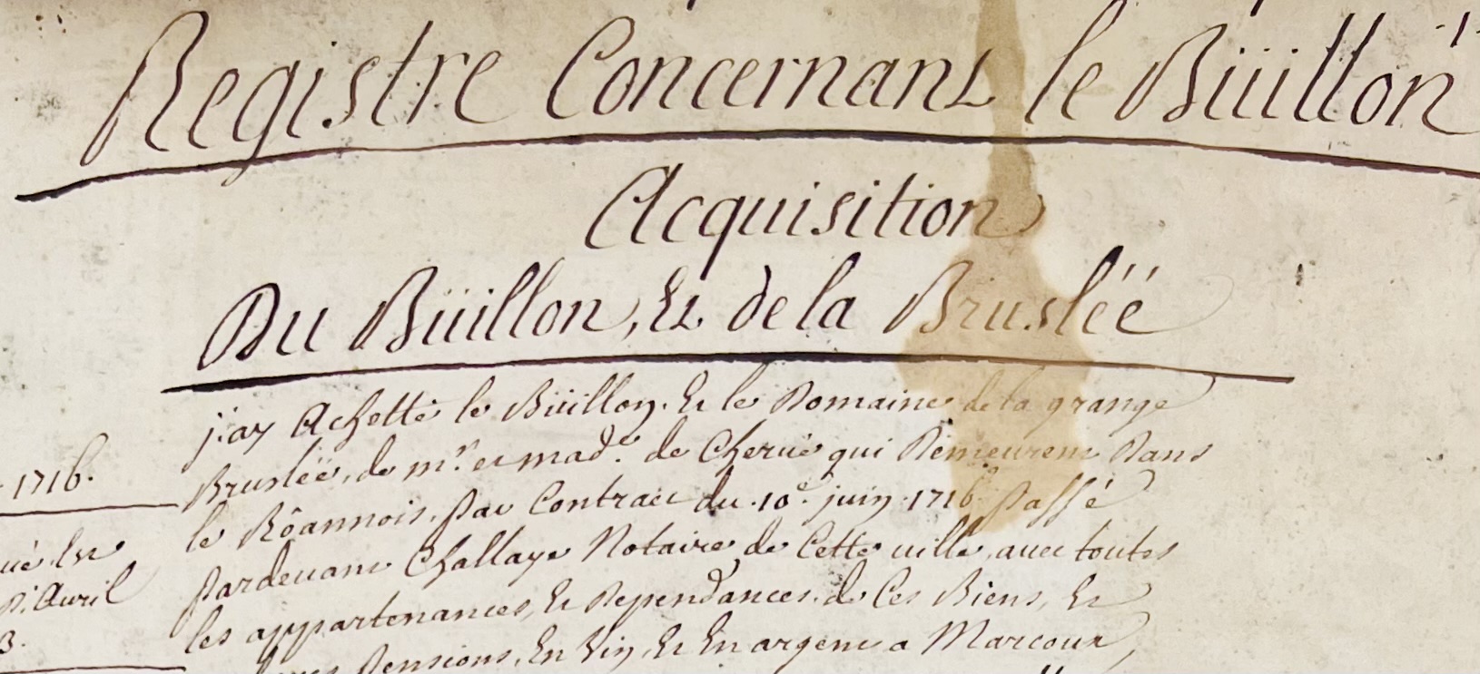 Livre de compte manuscrit du domaine du Bullion, fief de la paroisse de Chambéon dans le Forez. 10 juin 1716. J’ay acheté le Büillon et le domaine de la grange Bruslée de Mr. et Md.e de Cherüe qui demeurent dans le Röannais par contract le 10 juin 1716. Passé par devant Challaye notaire de cette ville avec toutes les appartenances et dépendances de ces biens et quelques pensions en vin et en argent à Marcoux. Le tout au prix de 17.000 livres. [En marge] Mad. de Cherüe au morte au mois d’avril 1733. Table : acquisition « du Büillon et de la Brusleë », paiement, réparations, meubles achetés, arbres plantés, jardin, garenne, glacière, bestiaux achetés, profit des brebis, moutons et cochons, volaille, oeufs, beurre fromage, char de foin, pain des moissonneurs, « ma dixme sur le Büillon », bois taillis, semailles, récoltes, semailles, récoltes, ventes de grains, l’étang Janin, l’étang du Colombier, l’étang du Robertet, l’étang du grand Razinet, l’étang du petit Razinet, la peschoire du Buillon, arches à poisson etc. L’ancien fief du Bullion possédé par les familles Prévost, Robertet, Papon et Du Guet est situé sur la commune de Chambéon, sur la rive gauche de la Loire dans le Forez. Cette seigneurie et ce domaine furent acquis le 24 novembre 1548, par Jean Papon (Crozet 1507- Marcoux 1590) lieutenant général du bailliage du Forez et du Roannais, juge ordinaire du Forez, conseiller au Parlement de Paris, maître des requêtes de Catherine de Médicis. D’abord lieutenant et conseiller du roi à Roanne, puis juge royal de Montbrison en 1529, lieutenant général du bailliage du Forez et du Roannais en 1543, juge ordinaire du Forez par provisions du 18 mai 1547, conseiller au Parlement de Paris, maître des requêtes de Catherine de Médicis, anobli par le roi Henri III en septembre 1578. il fut seigneur de Bullion (à Chambéon), terre acquise le 24 novembre 1548 pour 3600 livres, sieur de Goutelas (à Marcoux) terre acquise le 4 septembre 1549 pour 5000 livres, en même temps que possesseur d’un jardin au faubourg de la Croix de Montbrison, et d’une maison à Crozet. (Alain Monestier – généalogie Papon de Goutelas). Cette terre fut ensuite donnée en héritage à Melchior Papon son troisième fils, marié en 1587 avec Jeanne du Verney. Le même Melchior Papon reçut par le testament de son père fait en sa maison de Goutelas, le 20 avril 1582, une maison située dans le chapitre de Montbrison. François Papon rendit hommage au roi pour le fief des Bullion en 1674. » (Stéphane Prajalas-Trémoulhéac, Saint-Georges-en-Couzan Notes et documents, Village de Forez). Dufour, J.-E., Dictionnaire topographique du Forez et des paroisses du Lyonnais et du Beaujolais formant le département de la Loire, 1946, col. 118.