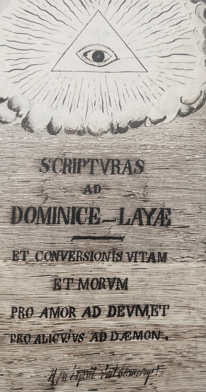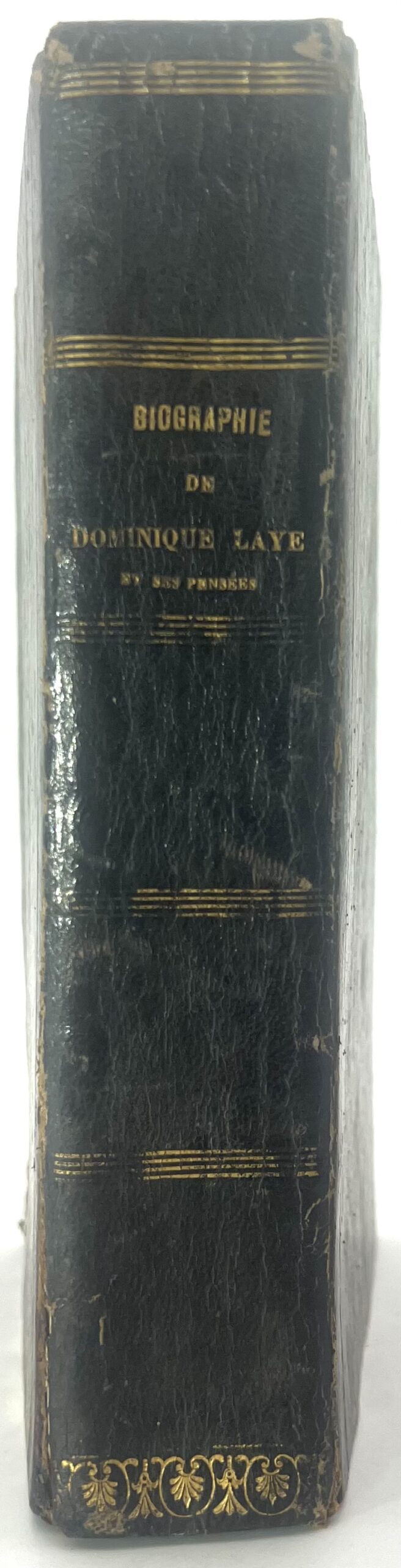 Manuscrit foisonnant d’un fou littéraire qui consigne ses visions mystiques et sociales dans un copieux recueil intitulé Les Oeuvres de la Raison dirigées par la Voix de Tonnerre écrites en caractères d’airain et gravées sur le Bronze avec le burin d’acier – dont le format sera inaltérable. Certains pourront s’instruire après moi : ceux qui tiendront plaisir à repasser ou méditer mes écrits qui sont en moi un vrai don naturel. Quelques titres de chapitres empruntés à l’abondante table des matières : Origine du monde, la Vraie religion ce qu’elle est et ce qu’elle exige, les Pauvres sont nos amis, une série des métiers et leurs qualités, Sermon sur les riches ou ceux qui ont envie de l’être, Le Grand Rêveur interprétant les songes, Catéchisme proverbial et des cas de conscience de la dernière expression, l’Avarice, les entretiens du Pécheur, Dernier document aux ouvriers etc. Précédé d’une courte autobiographie dans laquelle on apprend que Dominique Laye est né en 1827 à Boussan (Haute-Garonne) dans une une famille pauvre dont le père était chiffonnier. Trois ouvrages publiés sous son nom ont paru en 1886, imprimés à Toulouse : Le Prophète de la Haute-Garonne, Histoire complète des grèves de Decazeville sous la date lugubre du 26 Février 1886, Histoire de l’homme, son origine, ses moeurs, ses lois. Manuscrit d’une fine écriture très lisible resté inédit, orné d’un frontispice représentant l’oeil de la Providence placé dans un triangle avec la légende Scripturas ad Dominice-Layae et conversionis vitam et morum pro amor ad deum et pro alicuius ad daemon. Mon esprit voit beaucoup ! Mors du plat inférieur fendu en pied, traces de frottement, large mouillure aux feuillets liminaires.