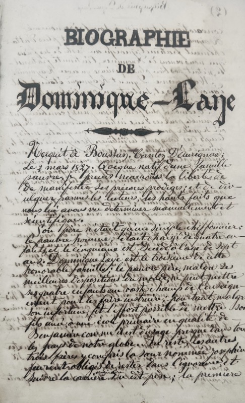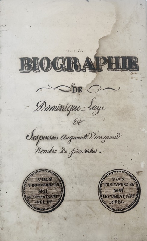 [Fou littéraire gascon. Manuscrit]. Biographie de Dominique Laye et ses pensées, augmenté d’un grand Nombre de proverbes. Inchotus, 25 October MVDDDLVIII.