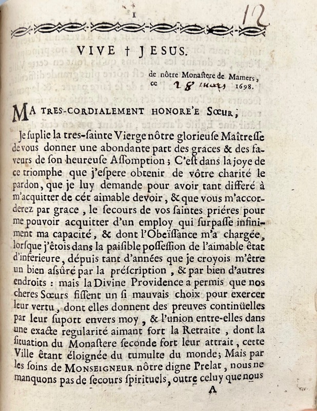 Important et très rare recueil de lettres circulaires destinées aux Visitandines du monastère de Gray fondé en 1636 en Franche-Comté, imprimées entre 1662 et 1710, puis réunies en 1788 accompagnées d’un avis manuscrit : « Ce volume contient 32 lettres circulaires (33 ndlr) plusieurs sont des relations des solennités faites à la canonisation de St Fr. de Sales. De plus trois fondations celles de Naples, de Modène et de Strasbourg. L’inégalité des papiers oblige d’insérer dans le même tome des lettres de mil sept cent avec mil six cent. Les chiffres de la table sont à chaque circulaire. [Suivi de :] Table des lettres circulaires et des vies des soeurs qu’elles contiennent ». La congrégation de la Visitation Sainte-Marie, fondée en 1610 à Annecy par François de Sales avec l’aide de la baronne Jeanne de Chantal, est un ordre contemplatif, réservé aux femmes, connu sous le nom de l’ordre des Visitandines. L’installation de leur première maison, à Annecy, est suivie de celles de Lyon, de Moulins puis de Grenoble, la quatrième, en 1621. Chaque lettre publiée à destination des autres maisons de la congrégation est le portrait d’une Soeur défunte ; on trouve aussi des points de règlement ou nouvelles recommandations. Ainsi ces circulaires n’étaient pas destinées à la publication mais à un usage interne ; elles étaient recueillies et conservées par chaque monastère, ici celui de Gray en Franche-Comté. « Au sein de l’ordre de la Visitation, la circulation des nouvelles se fait par le biais des lettres circulaires. (…) Les lettres circulaires servent ainsi de « trait d’union » entre les différentes communautés de l’ordre, qui doivent régulièrement rendre compte des événements survenus dans leurs maisons respectives. Les visitandines joignent à ces lettres les abrégés de la vie et des vertus de leurs compagnes. De la rédaction de la lettre circulaire et de l’abrégé jusqu’à la réception et à la conservation de ces documents par les autres communautés, il existe tout un rituel, scandé par différentes étapes. » (Juliette Pinçon). Contient : 1. [Monastère de Fribourg, 1662]. Cérémonies de da la solennité de la béatification du B. H. François de Sales faite au Monastère de la Visitation à Fribourg en Suisse. 20 pp. 2. [Monastère de Turin. 1662]. Relation de ce qui s’est passé en la solennité faite dans l’Église des Religieuses de la Visitation de Turin pour la béatification de François de Sales évêque de Genève le 25 juin 1662. Turin, Janel, 1662. 48 pp. 1 gravure hors texte. 3. [Monastère de Pont-à-Mousson. 1665]. Lettre d’un Ecclésiastique du Pont à Mousson à un sien ami à Paris touchant la solennité de la canonisation de S. François de Sales… célébrée audit Pont… le 20 sept. 1665. 23 pp. 4. [Monastère de Naples. 1691]. Lettre circulaire… de la Supérieure de Naples dans laquelle est insérée la fondation du cent quarante cinquième monastère de cet ordre. Turin, Zappate, 1697. (1)-64 pp. 5. [Monastère d’Alençon. 1694]. Vies de Madame la Présidente de Ray et de Marie Marguerite Le Noir. 12-14 pp. 6. [Monastère de Maux. 1694]. Vies de Marie Angélique Favre, Marie Éléonore de Mescrigny, Madeleine Dominique Piettré, Madeleine Turcau Tourière. (8) pp. 7. [Monastère de Mamers. 1694]. Vies de Françoise Thérèse de Leschamps, Marie-Augustine de Faudois, Marie de Ridou. 23 pp. 8. [Monastère d’Alençon. 1695]. Vies de Marie Augustine et Marie Françoise Sévin, Claude Espérance Champion, Anne Marguerite Martel. 7-36-12-30 pp. 9. [Monastère de Fribourg. 1696]. Vies de Marie Aimée de Reynold, Marie Ignace Chopar Tourière, Madeleine Brunan, Françoise Catherine Meyer, Séraphine Haberkorn, Marie Angélique Dupré. 18 pp. 10. [Monastère du Mans. 1696]. Vies de la Mère Marie Émmanuelle de Tesse, Anne Marie Charlot domestique. 50-7 pp. 11. [Monastère de Lyon. 1697]. Vies de la Mère Ferrus, des soeurs de Foudras, Boisse, d’Horonati, Rivoiret, de la Tourrelle. 31 pp. 12. [Monastère de Mamers. 1698]. 4-71-29-10-18 pp. Non reporté dans la table. 13. [Monastère de Turin. 1698]. Vies des soeurs Massoti, Alfieri, Tardite, Carracio. 48 pp. 14. Relation véritable de tout ce qui s’est passé en l’établissement du Monastère de (…) Modène. Aix, Charles David, s.d. 16 pp. 15. [Monastère de Cremieu. 1682]. Vies de Louise Angélique de Lancin, Marguerite Montlouvier. 22 pp. 16. [Monastère de Naples. 1701]. 8 pp. 17. [Second Monastère de Paris. 1701]. Vie de Catherine-Thérèse Brochant, nouvelles curieuses du monastère de Cracovie. 13-7 pp. 18. [Monastère de Strasbourg. 1701]. Vies de Marie Antoinette Viel, Marie Morise domestiques. 35 pp. 19. [Monastère de Fribourg. 1703]. Vies de Marie Euphrasie Bilos, des soeurs Python et Vondreveidt. 13 pp. 20. [3e monastère de Lyon. 1703]. 6 pp. 21. [Monastère de Turin. 1703] Vie de la soeur Tarin. 45 pp. 22. [Monastère de Paray. 1704]. Vies des soeurs Rosselin, Bouillet. 11 pp. 23. [Monastère de Nancy. 1704]. Vies de Marie Le Gand, Madeleine Vincent, Louise de Rosen, Thérèse de Tiétry, Marie Xavier des Sables de Rorté. 34 pp. (les pages 3 à 6 manquent). 24. [Monastère de Toulon. 1705]. Vie de la soeur Ripert de Carquairane. 8 pp. 25. [Monastère de Nancy. 1706]. 17 pp. 26. [Monastère de Mons. 1707]. Vie de de la soeur Carlier 9 pp. 27. [Monastère de Turin. 1707]. 15 pp. 28. [Monastère d’Alençon. 1708]. Vie de Marthe Angélique de Boulai. 8-38 pp. 29. [Monastère de Fribourg. 1708]. 20 pp. 30. [Monastère de Mons. 1710]. 33 pp. 31. [Monastère d’Issoudun. 1700]. Vie de Mère Jeanne Madeleine Delachastre. 3-5 pp. 32. [Monastère de Pont-à-Mousson. 1710]. 6 pp. 33. [Monastère de Mamers. 1710]. 5 pp. Deux lettres sont chiffrées par erreur 12 dont celle du monastère de Mamers qui n’est pas reportée dans la table manuscrite en tête de volume. Voir : Université de Lyon, Juliette Pinçon, Quand