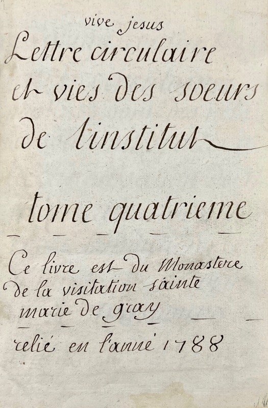 ![[Franche-Comté. Ordre de la Visitation de Sainte-Marie. Monastère de Gray]. Lettres circulaires et Vies des Soeurs de l'Institut. Tome quatrième. Ce livre est du Monastère de la Visitation Sainte Marie de Gray relié en l'année 1788. – Image 2](https://bonnefoi-livres-anciens.com/wp-content/uploads/2025/08/43249_2.jpg)