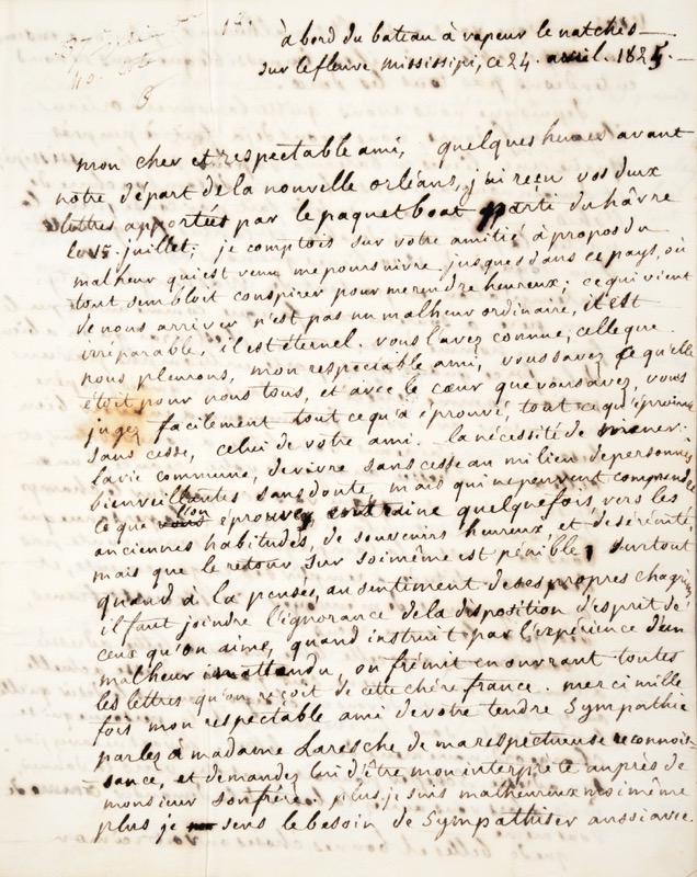 Belle lettre du fils de Lafayette de retour des États-Unis avec son père. « Depuis que nous avons quitté la Nouvelle-Orléans il y a neuf jours, nous avons déjà fait à peu près quatre cent lieues en bateau à vapeur sur le Mississippi ; et demain nous arrivons à hauteur de l’embouchure de l’Ohio. Nous avons déjà fait par conséquent la partie la plus considérable et la plus fatigante d’un voyage de 1800 lieues que nous avions en contemplation en partant de Washington City. Mon père a soutenu cette fatigue comme auroit pu le faire un homme de trente ans ; il est vrai qu’on a bien de la force quand on est porté en triomphe par une nation comme celle-ci… Dans cinq mois j’espère que nous serons avec vous, je commence à en avoir bien besoin ». Il rend compte d’une démarche auprès d’un débiteur de son ami et le charge de faire parvenir une lettre à l’ami Saint-Amand. « Que de belles et bonnes choses on voit ici mon respectable ami […]. Mon Pays, mes amis qui me sont conservés, le souvenir de ceux qui m’ont été enlevés, occupent tout mon coeur en commun avec la reconnoissance envers les grands citoyens de ce pays modèle ». Le 10 mai, bref récit d’un « naufrage de rivière ».