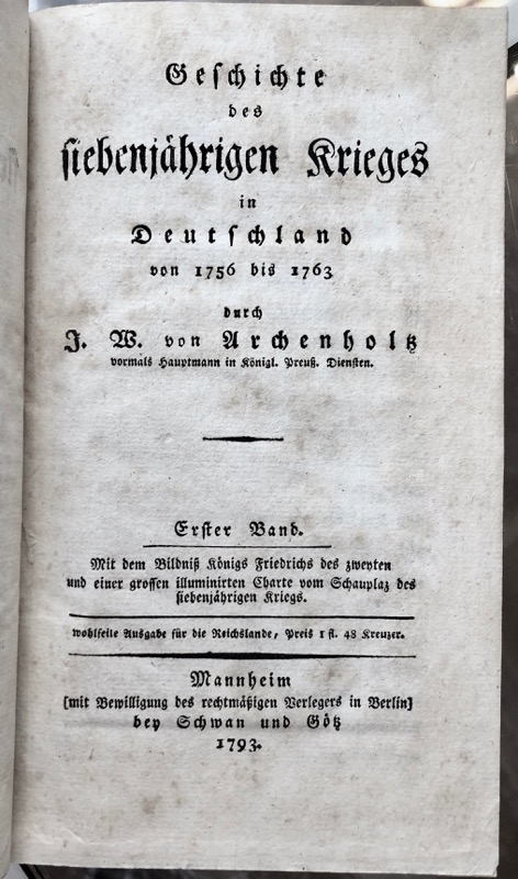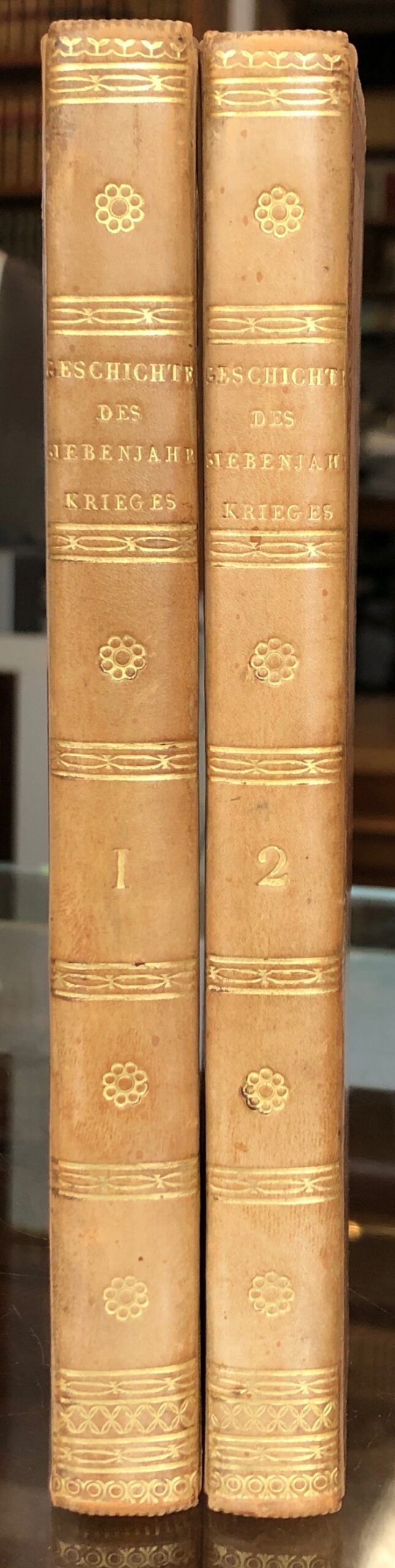 Troisième édition ornée d’un portrait de Frédéric II en frontispice dessiné par Linder et gravé par Berger. L’édition originale fut publiée en 1788. Histoire de la guerre de Sept ans par Johann-Wilhelm von Archenholtz (1741-1812) à laquelle il participa. « Par une étude exacte de toutes les sources, il parvint à satisfaire le savant de profession ; par un récit simple et animé, il plut à la masse des lecteurs, ordinairement moins exigeants. Le succès fut grand et mérité » (Hoefer). Carte repliée en couleurs (46 x 39 cm) de l’Europe du Nord durant la guerre de sept ans dressée par Carl Jäck. Provenance : De la Bibliothèque du vicomte de Bourbon-Busset (ex-libris). Très bel exemplaire.