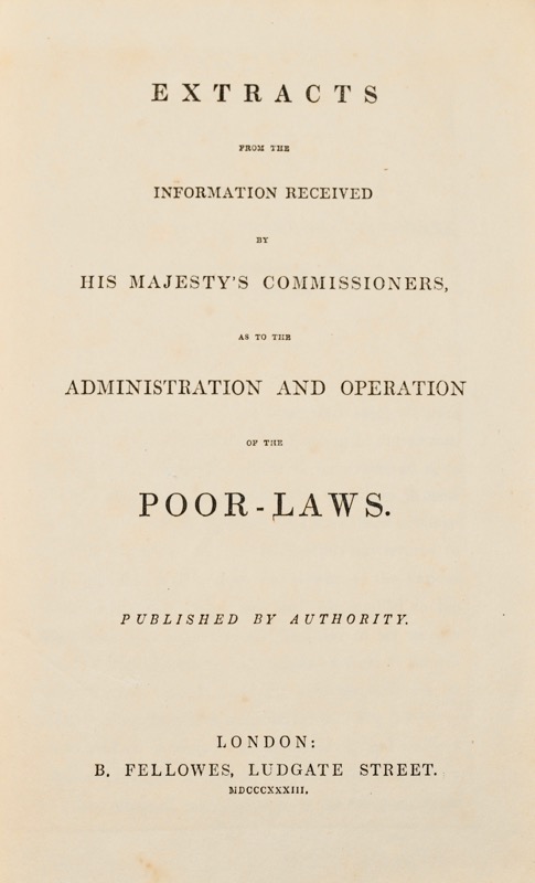 Édition originale. En 1832, une commission royale fut chargée d’enquêter sur les aides financières apportées aux plus pauvres en Angleterre appelées Poor Laws – Lois sur les indigents et de proposer des solutions pour mieux soulager la pauvreté qui allaient aboutir à la New Poor Law – Nouvelle loi sur les pauvres de 1834. Le faux-titre porte : « Administration and operation of the poor-laws » ; la lettre d’envoi au Home Department est signée : Poor-law commission.
