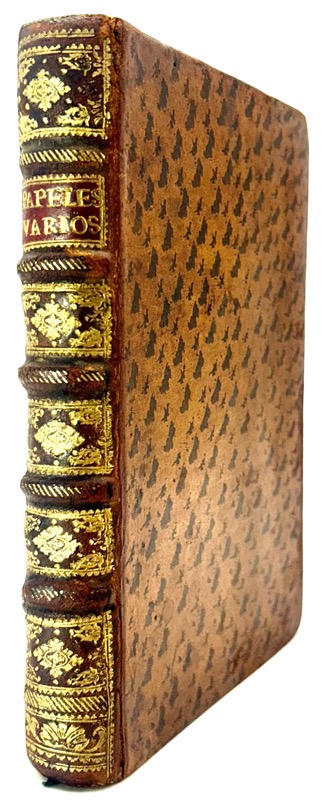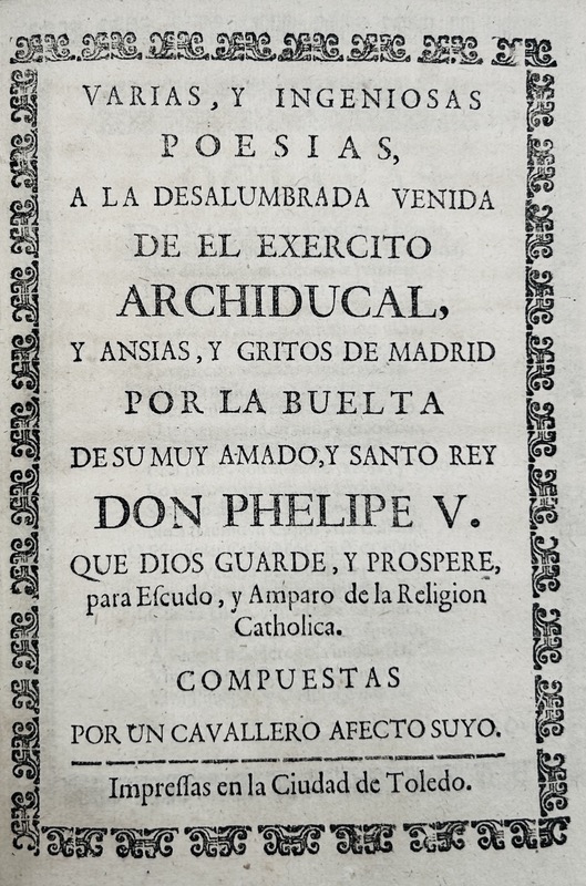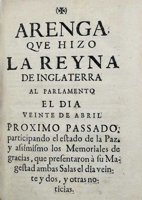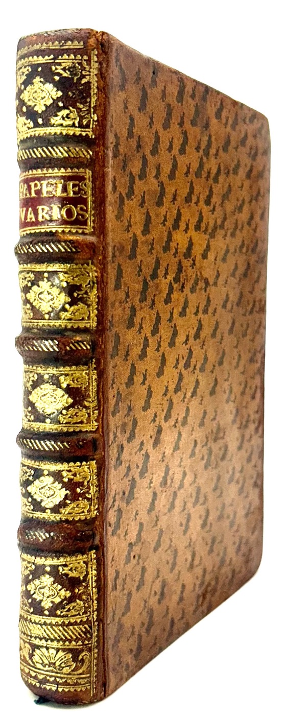 Recueil de pièces de circonstance en langue espagnole, historiques et littéraires imprimées à Madrid pendant la Guerre de Succession d’Espagne. La guerre de succession d’Espagne qui se déroula de 1701 à 1714 opposa la France de Louis XIV et son alliée l’Espagne de Philippe V à l’empereur germanique Léopold Ier, allié au roi Guillaume III d’Angleterre et au gouvernement des Provinces-Unies. Depuis la mort sans descendance le 1er novembre 1700 de Charles II roi d’Espagne, les deux principales familles régnantes d’Europe, les Bourbon (France) et les Habsbourg (Autriche) revendiquaient le trône d’Espagne. Petit-fils du roi Louis XIV, Philippe V (1683-1746) fut le premier roi d’Espagne issu de la dynastie des Bourbons. Provenance : Ex-libris armorié de José de Guzmán y Guevara (Madrid 1709 – 1781), Jefe de la Casa Real de Carlos III. Contient : 1 • Juegan a España, como polla, al juego del hombre. En Colonia, en casa de Pedro Vray, 1703. (4) pp. 2 • Segunda parte del juego del hombre, entre los soberanos de la Europa, sobre ganar la polla de España. Declaranse los triunfos, y cartas, que tiene cada uno, y los mirones. (En Colonia, En casa de Pedro Vray, 1703). (4) pp. 3 • Tercera parte de el juego del hombre, entre los personajes de la Europa, sobre otra nueva mano; y que se pague el renuncio hecho. S.l.n.d. (Madrid, Juan Garcia Infanzon, c.1704). 4 pp. Jeu de cartes dit « de l’Hombre » apparu en Espagne à la fin du XVIe siècle, réimprimé à la fausse adresse de Cologne lors de la Guerre de Succession d’Espagne. Palau, VII, 125744. 4 • Copia de carta que la villa de Madrid escrivió al Rey Nuestro Señor, luego que se librò de la opression de los enemigos con sus comissarios que passaron à Talavera à encontrar à Su Magestad. S.l.n.d. (1710). 6 pp. Titre de départ. Daté à la fin 23 novembre 1710. Palau, IV, 61460. 5 • Relacion diaria de lo sucedido en Madrid desde que el Rey N. Seõr llegó de la jornada de Cataluña dia 6 de Junio, hasta el dia 5 de Agosto de 1706. En Madrid , 1706. 8 pp. Palau, XVI, 259115. 6 • Representacion del señor marques D. Lorenzo Verzuso Verecti Landi del consejo secreto de su magestad en Milan… a las… republicas de Esguizaros y Grisones hecha en Lucerna… a 26 de Febrero de 1706. S.l.n.d. (Madrid, 1706). 4 pp. 7 • Progressos del cielo, en defensa de la Religión Catolica, contra los hereges, y en favor de sus Magestades, Catolica, y Christianissima, protegidos de nuestra Señora Maria Inmaculada : romance endecasilabo. S.l.n.d. (Madrid, 1706). (8) pp. 8 • Audiencia que pidiò a nuestro Rey, y señor Phelippe Quinto, un estudiante Gorron, que se entrò en Lisboa, sin ser conocido, y dà quenta de lo que passa con la Dieta. S.l.n.d. 7 pp. 9 • [PEREZ (Luis el Gallego)] Tercera carta, en que continua su correspondencia Luis Perez el Gallego, al amigo ausente, en el idioma començado de titulos de comedias, dandole quenta de el estado en que se hallan los personages de la Europa. S.l.n.d. (8) pp. 10 • [PEREZ (Luis el Gallego)]. Carta escrita en titulos de Comedias, por L. Perez el Gallego, à un Am igo ausente de la Corte. [pp. 7-12] Motivos universales, en los Heroes que representa en el Teatro de la Europa, la serie del mayor empeño, discurrido sobre titulos de Comedias. Redondillas. S.l.n.d. (Madrid 1708). Palau, XIII, 219390. 11 • Llora Valencia su mudada fortuna. (Madrid, 1706). 4 pp. 12 • Romance nuevo Lamentos y suspiros que la infeliz ciudad de Barcelona, desengañada de su yerro y sin esperança de alivio esparce à el viento, para el desengaño de los demàs Reynos. En Madrid, 1706. 4 pp. 13 • Tono, en elogio de nuestros catolicos Reyes Don Felipe Quinto, y Doña Maria Luisa Gabriela de Saboya, que Dios guarde. S.l.n.d. (c. 1707). (4) pp. 14 • Caxa marcial de recluta. S.l.n.d. (c. 1704). 16 pp. 15 • PERICO. Epistola Autentica, Y Historica Al Christianissimo Luis XIV. Gran Rey de Francia; y Sumario Juridico de las hazañas, tuertos, y derechos de las armas del señor Archiduque Carlos de Austria en su nueva venida à Castilla la Nueva, y del glorioso fin de tan gloriosa expedicion, y hazañas, fecho, y testificado año 1710. (Madrid, 1710). 12 pp. Palau XIII, 222955. 16 • Letrilla Curiosa, graciosa, y entretenida, à la bienvenida à su Corte de nuestros Catolicos, y legitimos Reyes, segunda vez triunfantes. S.l.n.d. (Madrid, 1710). 4 pp. Palau VII, 136821. 17 • La Junta, que se ha celebrado por los leales vassallos de Su Magestad el Señor Phelipo Quinto (que Dios guarde) motivada de su buen zelo, promulga catorze artículos a lo Humano, que son ciertos en el estado presente ; y conviene, que los españoles pueblos los crean, y confiessen, so pena, que el que no, serà tenido por cismatico, Sebastianista, y castigados como tales, faltando à qualquiera de ellos, que son los siguientes. S.l.n.d. (4) pp. Palau, VII, 126188. 18 • Título Varias, e ingeniosas poesias, a la desalumbrada venida de el Exercito Archiducal, y ansias, y gritos de Madrid, por la buelta de su muy amado, y Santo Rey Don Felipe Quinto, que Dios guarde, y prospère, para Escudo, y amparo de la Religion Catholicac. S.l. 1710. (8) pp. 19 • AYALA Y SALZEDO (Manuel de). Parabien a la Iglesia Catholica, en los gloriosos triunfos de nuestro invicto monarca D. Phelipe Quinto. (Madrid, 1710). (4)-44 pp. Palau, I, 20777. 20 • Relacion del combate, y feliz victoria de las armas de las dos coronas contra los Olandeses y aliados en su campo de Ekeren y Capell el dia treinta de Junio de 1703. Madrid, Antonio Bizarrón 1703. 8 pp. Palau, XVI, 259074. 21 • Título Exacta, y veridica noticia de los Funestos estragos, causados por la continuacion de los grandes Terremotos en Roma, y otras partes de Italia. Roma 24. de Febrero de 1703. Madrid, Antonio Bizarròn (1703). 4 pp. Supplément au n° 9 de la « Gauta de Madrid » 27 février 1703. 22 • Simulacro de la fè. S.l.n.d. (1708). 8 pp. Panégyrique de Ph