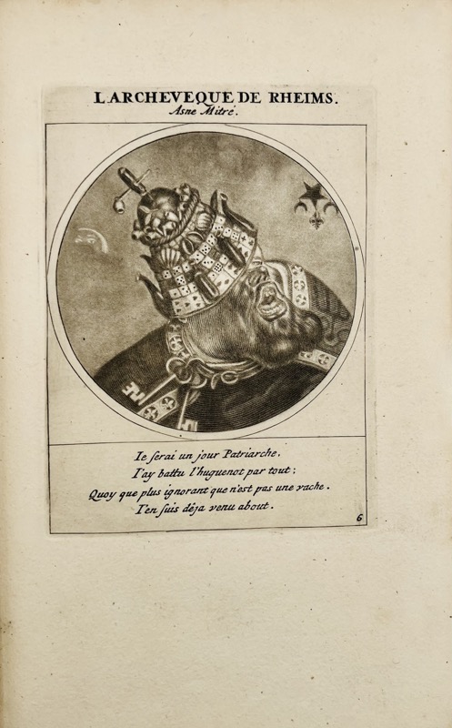 Suite complète imprimée en Hollande de 24 portraits satiriques gravés à la manière noire et numérotés, représentant le roi Louis XIV et différents personnages liés à la révocation de l’édit de Nantes : Guillaume de Furstenberg, Louvois, Bossuet, Beaumier, Pelisson, l’évêque de Saintes, l’archevêque de Paris, Maimbourg, Peters, La Reynie, Demevin, la Rapine, l’archevêque de Reims, du Viger, le Camus, Mme de Maintenon, le commissaire de la Mare, Le Tellier, Boufflers, Marillac, Baville, le Père la Chaise et le roi Jacques II. « Lorsque vint la révocation de l’édit de Nantes, des Protestants prêtèrent à cette guerre par l’image l’appui de leurs idées et de leur haine légitime, si bien qu’on peut rencontrer dans plusieurs pièces, non pas une exécution, mais une inspiration française. Les Protestants se vengèrent ainsi des supplices qu’on leur avait fait endurer (…) en publiant le recueil Héros de la Ligue, suite de portraits-charge, travestis d’une façon plus ou moins spirituelle, de tous les évêques, ministres et autres personnages politiques ayant pris part à la révocation » (Grand-Carteret). Les portraits sont attribuées à Cornelis Dusart (1660-1704) et Bernard Picart (1673-1733) gravés par Jacob Gole (1660-1737) ; le recueil fut imprimé à Amsterdam (l’adresse parisienne est fictive). Chaque caricature est accompagnée d’un quatrain. Le propos et le style de l’ouvrage sont à rapprocher d’un autre recueil du même graveur : le Renversement de la morale chrétienne publié vers 1695. Léon Gozlan appelait cet ouvrage le Diamant de la librairie pittoresque des temps passés, et lui a consacré divers articles dans le Musée de la caricature en 1838. Bel exemplaire. Comme dans de nombreuses copies, la date a été caviardée par l’éditeur pour actualiser l’édition. Grand-Carteret, Les Moeurs et la caricature en France, p. 15 ; Hollstein, Dutch and Flemish Etchings, Engravings and Woodcuts 1450-1700, VI, 63-88 ; Dutuit IV, 145-147.