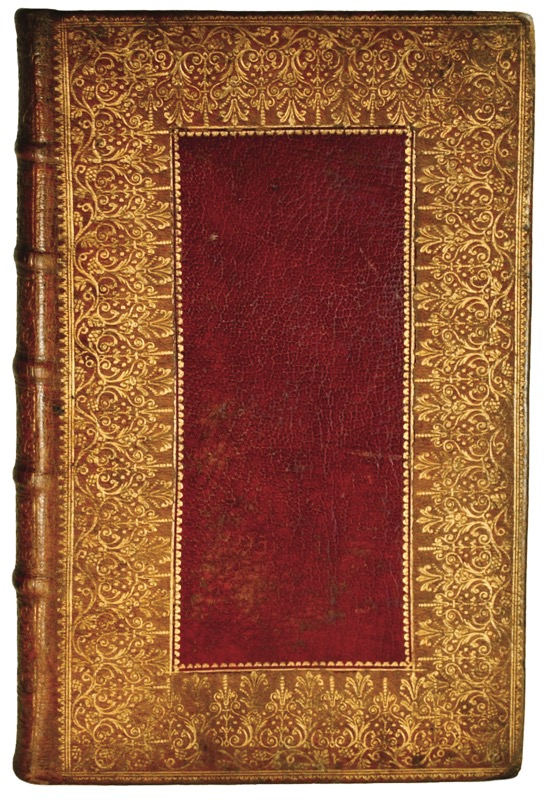 In-8 de (6)-260-(4) pp., maroquin lavallière, dos orné à nerfs, large dentelle encadrant un rectangle central de maroquin rouge sur chaque plat, contreplats doublés de soie verte, guillochis dorés sur les coupes, signet de soie rose, tranches dorées sur marbrure (reliure de l’époque).