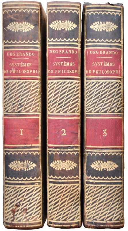 Édition originale. L’ouvrage, dont l’influence fut considérable au XIXe siècle, est de première importance pour l’introduction en France des pensées philosophiques écossaise et allemande. Gérando (1772-1842) ne veut que faire une introduction générale à l’histoire de la philosophie, et préparer à ses successeurs une nomenclature régulière et simple, analogue à celle des naturalistes. En dix-sept chapitres il donne des notions, encore exactes pour la plus grande partie, sur toutes les écoles, même sur celles qu’on estimait le moins. Bel exemplaire.
