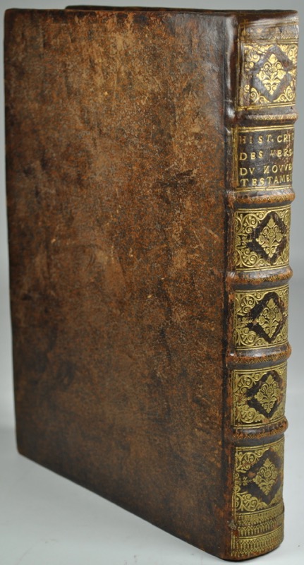 Édition originale. Le Père Richard Simon (1638-1712) fondateur de la critique et de l’exégèse biblique, né à Dieppe d’une famille modeste, fit ses études surtout chez les oratoriens de la ville. Étant entré à l’Oratoire provisoirement en 1659, puis définitivement en 1662, il fut ordonné prêtre en 1670. Il suivit avant son sacerdoce, des cours de philosophie, de théologie, d’écriture sainte, et lui-même il enseigna ; il se montra très indépendant de ses maîtres. Il publia divers écrits sur les Juifs ; parce qu’à eux avait été confié le dépôt de la tradition ; il ne voulait pas qu’on les calomniât, mais il critiquait fort leurs commentateurs de la Bible. En 1678 parut l’Histoire critique du Vieux Testament, le principal de ses ouvrages et qui a fait le plus de bruit dans lequel l’auteur annonçait que les auteurs de la sainte Écriture « pour être prophètes n’ont pas cessé d’être hommes : « Le livre rencontre des adversaires chez les protestants et les catholiques : Bossuet fut sévère, Nicole et les jansénistes aussi. En 1683, l’ouvrage fut mis à l’index. En 1689, à Rotterdam, il fait paraître l’histoire critique du texte du Nouveau Testament ; il suffit dit-il que l’Écriture soit inspirée quant à la substance ; on ne doit entendre par inspiration qu’une direction de l’Esprit saint qui a empêché les auteurs sacrés de tomber dans l’erreur. Il publie ensuite l’histoire critique des versions du Nouveau Testament, à nouveau contrariée par Bossuet. Grente, p.1182. Brunet, V, 394. Quelques rousseurs. Bel exemplaire.