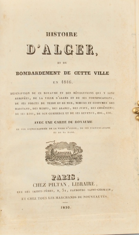Nouvelle édition de l’Histoire d’Alger publiée en 1725, augmentée d’une relation du bombardement d’Alger par Lord Exmouth. Description de ce Royaume et des Révolutions qui y sont arrivés, de la ville d’Alger et de ses Fortifications, de ses Forces de terre et de mer, Moeurs et Coutumes des habitants, des Mores, des Arabes, des Juifs, des Chrétiens, de ses Lois, de son Commerce et de ses Revenus, etc. etc. Avec une carte du royaume et vue lithographiée de la ville d’Alger, de ses fortifications et de sa rade. Laugier de Tassy (1757 – 23 janvier 1833) chancelier du consulat à Alger (1717-1718), puis commissaire de la marine à Amsterdam (1725) brosse un portrait du royaume d’Alger et de sa capitale, en rupture radicale avec l’imagerie qui prévalait en ce temps. Le 27 août 1816, le bombardement de la rade d’Alger est effectué par une flotte de la marine des Pays-Bas et de la Royal Navy commandée par Edward Pellew (1757-1833), premier vicomte d’Exmouth. Bien complet de la planche dépliante la Vue lithographié de la ville d’Alger de ses fortifications et de sa rade (38 cm X 28 cm) et de la carte dépliante du Royaume d’Alger (24 cm X 20 cm). Ex-libris manuscrit sur le feuillet de garde à l’encre du temps : Monsieur le marquis de Charnacé au Boismontbourcher, 1847 et envoi manuscrit non signé à l’encre du temps sur le feuillet de faux titre : A Monsieur le Marquis de Charnacé hôtel […] rue de Richelieu n° 79. Avril 1830. A cette emplacement fut construit en 1634 un hôtel pour le chirugien du roi François Thévenin n° 77-79. En 1685, on trouve à cet emplacement l’hôtel Ménars puis en 1733, le petit hôtel Boutin (n° 77) et le grand hôtel Boutin (n°79) qui appartient à partir de 1824 à la Compagnie générale d’assurance sur la vie. Ces deux hôtels furent démolis en 1869. (Jacques Hillairet, Dictionnaire des rues de Paris, II, p. 345-346). Bel exemplaire.