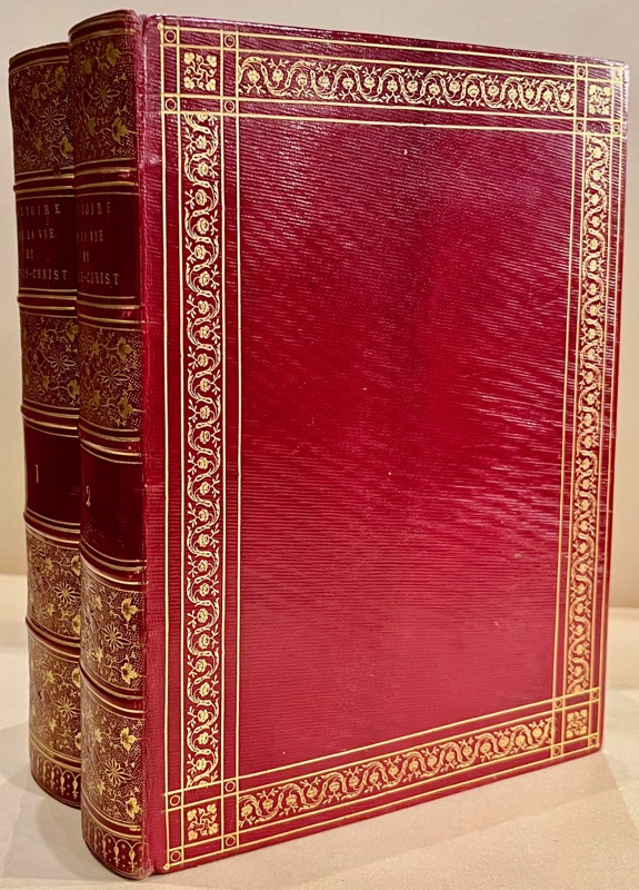 2 vol. in-4 de (4)-VIII-514 pp. 1 frontispice et 38 planches ; (4)-534 pp., 1 carte gravée dépliante, 1 frontispice et 34 planches, maroquin rouge à grains longs, dos à cinq nerfs minces orné de pointillés et feuilles, cadre à une roulette aux volutes florales sur les plats, filet strié sur les coupes et les coiffes, doublures et gardes de tabis bleu, tranches dorées (Rel. P. Bozerian jeune).