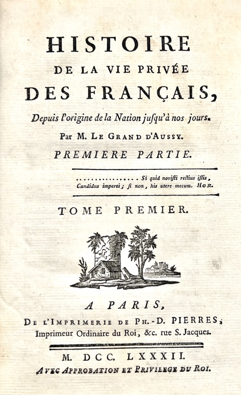 Édition originale. Vaste fresque historique de tout ce qui touche à la nourriture de l’homme. Ces trois volumes ne sont que la première partie d’une histoire que se proposait d’écrire Le Grand d’Aussy, mais qui n’a pas vu le jour. L’auteur y étudie en détail tout ce qui a rapport à l’alimentation, aux repas, festins et usages de table observés en France ; on y trouve également des renseignements sur les diverses corporations des charcutiers, cuisiniers, pâtissiers, oublieurs, etc. Le troisième volume se termine par une pièce du XIIIe siècle, intitulée Proverbes, et qui contient, dit Le Grand d’Aussy, « les choses de ce tems qui avaient le plus de réputation ou celles qui étaient devenues proverbiales ». Très bon exemplaire. Vicaire, 510 ; Bitting, p. 280 ; Livres en Bouche, 6.