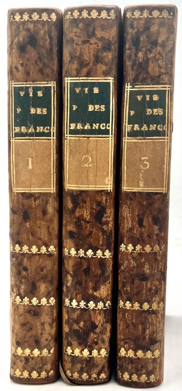 3 vol. in-8 de XIII-(3)-373-(1) pp. ; (4)-383 pp. ; (4)-363 pp., demi-veau, dos lisse ornés d’une roulette dorée, pièces de titre et de tomaison en basane (reliure de l’époque).