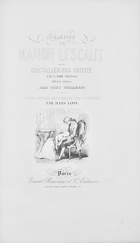Premier tirage des illustrations de Tony Johannot dont 18 planches hors-texte tirées sur Chine monté et 90 vignettes dans le texte. Frontispice en camaïeu gravé sur bois par Andrew, Best et Leloir, d’après E. Wattier. Le titre « Manon Lescaut” est inscrit en lettres blanches, conforme au premier tirage ; exemplaire complet des deux faux-titres ornementés et dorés, un pour chaque partie. Quelques très rares rousseurs. Bel exemplaire en reliure d’époque, non rogné, à toutes marges. Vicaire, VI, 814 ; Carteret, III, 505 : « Un des beaux livres de la période romantique ».