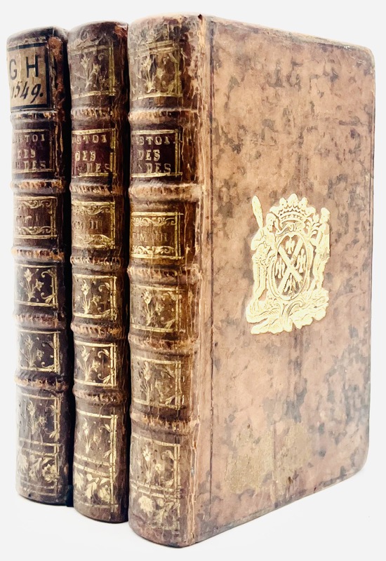 Édition originale Ouvrage illustré de 2 cartes hors-texte dépliantes : l’Inde à l’époque d’Alexandre le Grand ; Carte des Indes Orientales avec 1 plan de Pondichéry, en 1741. L’édition fut partagée entre plusieurs libraires. Tome I : Des Indes anciennes ; tome II : Des Indes modernes ; tome III : Commerces des Indes. Armes non identifiées sur les plats. Ex-libris : M. Debert-de-Clerzac. Trace claire de mouillures marginales sur quelques feuillets du tome I. Chadenat, 2903 ; INED, 2217.