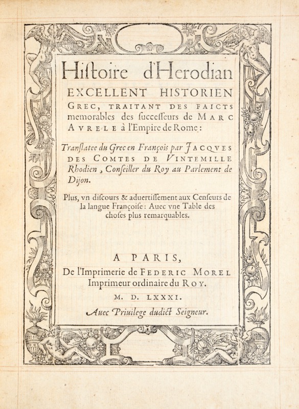 Deuxième édition en second tirage de la traduction française établie sur le texte original grec par l’helléniste Jacques des Comtes de Vintemille, publiée une première fois en 1554. Le premier tirage en tout point conforme est daté 1580. C’est la source première sur le règne des Empereurs romains depuis Marc Aurèle jusqu’à l’avènement de Gordien III (238) par l’historiographe grec témoin d’une partie des événements rapportés, Hérodien alors administrateur romain. Une autre traduction française de l’Histoire d’Herodian établie sur la version latine d’Ange Politien apparut également au XVIe siècle. Belle impression réglée de filets rouges sortie des presses de Frédéric Morel, titre encadré, lettrines, bandeaux et culs de lampe gravés sur bois. Pièces liminaires : Épître dédicatoire à Philibert-Emmanuel de Savoie datée de Dijon 1580, pièces de vers latins et français à l’auteur ; Advertissement et remonstrance aux censeurs de la langue françoise. Provenance : Valentin Conrart. Précieux exemplaire aux armes et au chiffre conservés dans les contreplats de Valentin Conrart (1603-1675) cité par Olivier Hermal Roton ; passionné de belles-lettres, Valentin Conrart se lia avec les plus célèbres auteurs de son temps qu’il réunissait chez lui un jour par semaine : c’est cette assemblée qui devint en 1634 l’Académie Française dont Conrart fut élu secrétaire perpétuel dès l’origine. Bien que calviniste zélé, il fut nommé le 16 juin 1627 conseiller et secrétaire du Roi, charge qu’il résigna le 20 janvier 1658. Il mourut le 23 septembre 1675, sans laisser de postérité de son union avec Madeleine Muisson qu’il avait épousée le 19 mars 1627. Le père de l’Académie Française, qui faisait autorité chez ses contemporains au point de vue littéraire, quoiqu’il n’eût appris ni le grec ni le latin, avait formé une bibliothèque considérable en recueillant en dehors d’ouvrages italiens, espagnols et français, les manuscrits d’une foule de pièces sur tous les sujets spécialement sur la littérature qui auraient disparu sans lui. Robert Hoe avec ex-libris sur la garde supérieure. Olivier Hermal Roton, planche 928, fers n°1 et 2 (cet exemplaire) ; Brunet, III, 121 ; Joseph Dumoulin, Vie et oeuvres de Frédéric Morel, n°327 ; Catalogue of the Library of Robert Hoe, III, 1475.