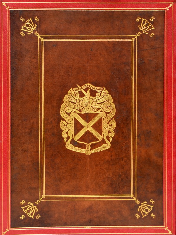 In-4 (165 x 220 mm) de (28)-225-(14) pp. 1 p.bl., maroquin rouge, dos orné à nerfs, triple filet doré d’encadrement sur les plats, double filet doré sur les coupes, doublures de veau armorié et monogrammé provenant de la précédente reliure, double garde de papier marbré, étui bordé (Thibaron).