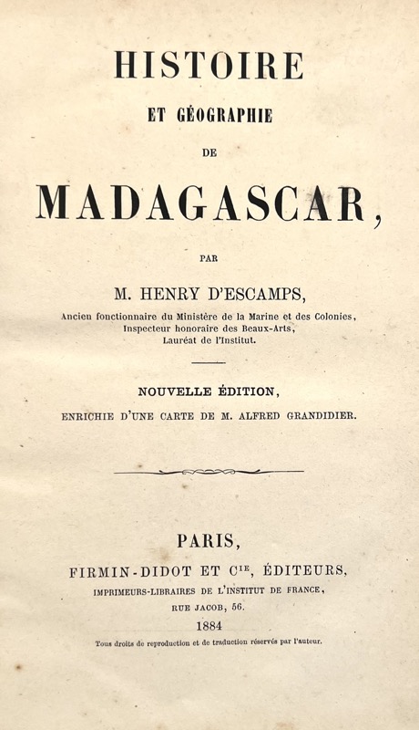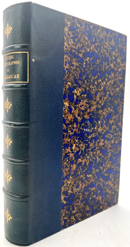 Nouvelle édition de l’Histoire et géographie de Madagascar depuis la découverte de l’île en 1506 publiée une première fois en 1846 sous le pseudonyme de «Macé Descartes», imprimée de nouveau à la suite de l’expédition de Madagascar en 1881-1882 qui conduit à la colonisation de l’île par la France. Une somme sur Madagascar avant la conquête coloniale. Depuis 1828, sous la férule de la reine Ranavalo, la Grande Île resta strictement fermée aux étrangers pendant trente ans. Henry Descamps (1815-1891) fait valoir qu’il n’existe aucun ouvrage d’ensemble sur Madagascar, hormis celui de William Ellis. Chantre de la conquête coloniale, Descamps a eu accès aux sources officielles. Manifestement inspiré par le lobby malgache, il s’agit de contrer les visées anglaises tout en revendiquant « la grande île française de la mer des Indes » (depuis son annexion prononcée sous Louis XIV). Ex-libris (étiquette) E-L Béral-Delord ; dos légèrement passé. Très bon exemplaire. Gay, n°3220.