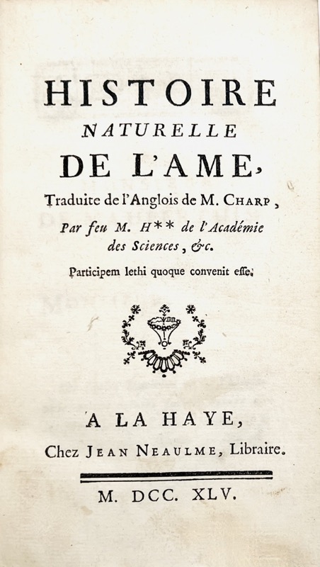![[LA METTRIE (Julien Offray de)]. Histoire naturelle de l'âme, traduite de l'anglois de M. Charp, par feu M. H** de l'Académie des sciences, &c.](https://bonnefoi-livres-anciens.com/wp-content/uploads/2025/10/44486_1.jpg)