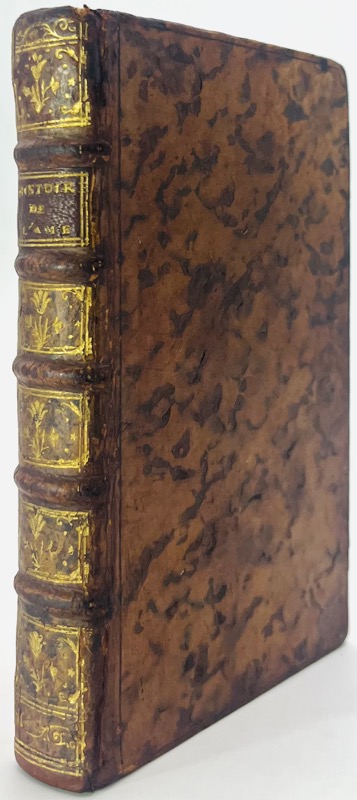 Édition originale d’un des principaux ouvrages philosophiques de l’auteur, dans lequel il expose sa théorie matérialiste de l’âme. Elle est dédiée à Maupertuis, ami de La Mettrie avec lequel il collabora parfois. Sur le titre, la mention : traduit de l’anglois de M. Charp, par feu M. H**, est fallacieuse : l’ouvrage a bien composé et publié en français. Charp est un des pseudonymes de l’auteur et l’initiale H** désigne probablement Hunault, qui avait été son maître à Saint-Malo. Ayant observé, lors d’une maladie qu’il avait contractée, que l’affaiblissement des facultés morales avait suivi celui des organes, La Mettrie en conclut que la pensée n’était qu’un produit de l’organisation. Il publia ses idées dans l’Histoire naturelle de l’âme. L’orage que ce livre souleva lui fit perdre sa place de médecin des gardes. L’Histoire naturelle de l’âme fut saisie et condamnée au feu par le Parlement de Paris le 7 juillet 1746. Coiffe de pied restaurée. Très bon exemplaire. Tchemerzine III, 946 ; Stoddard, n°18.