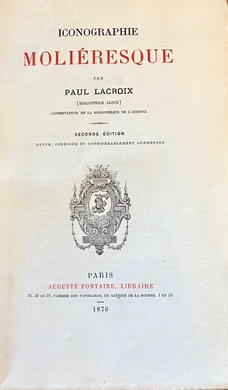 Deuxième édition revue, corrigée et augmentée. Un des cinq cents exemplaire sur hollande. Titre imprimé en noir et rouge. Un portrait gravé de Molière dans le rôle de Sganarelle et fac-similé de l’autographe de Molière. Un mors fendu sur 2 cm. Exemplaire de la bibliothèque d’Anatole de Montaiglon à son chiffre. Vicaire IV, 849.