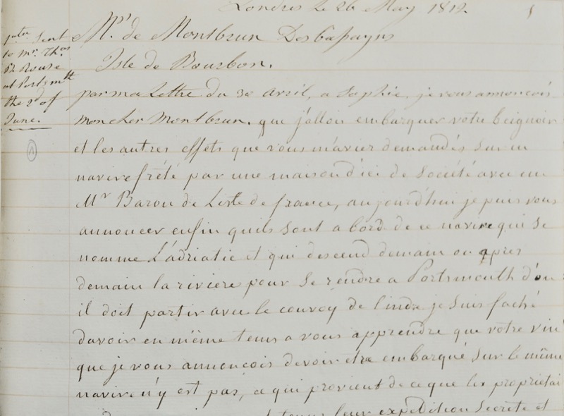 Ce registre manuscrit de correspondance, couvrant la période du 26 mai 1812 au 26 septembre 1816, constitue une source précieuse pour l’étude des échanges commerciaux et des dynamiques politiques de l’époque napoléonienne et post-napoléonienne. Bien que l’identité précise de l’auteur demeure incertaine, une tradition attribue ces lettres à un membre de la famille Falligan, influente lignée gantoise qui a marqué l’histoire de la ville de Gand par son hôtel particulier situé sur le Kouter, place emblématique de la cité. Organisation et contenu. Le manuscrit s’articule en deux volets distincts : Un registre alphabétique des correspondants, présenté sur des feuillets à onglets latéraux, permettant une navigation rapide dans le corpus. La minute des lettres expédiées, principalement rédigées depuis Londres (155 des 156 lettres), à l’exception de la dernière, écrite depuis Paris. Ces correspondances, rédigées pour l’essentiel en français, parfois en anglais, traitent majoritairement de sujets commerciaux et financiers : expédition de factures, connaissements, états financiers, comptes rendus d’affaires, ou encore le suivi des cours commerciaux. Les correspondants sont localisés pour la plupart aux Antilles (notamment en Martinique), à l’île Bourbon (aujourd’hui l’île Maurice) et à l’île de France (La Réunion). Correspondance personnelle et contexte historique. Cependant, certaines lettres se distinguent par leur caractère personnel, en particulier celles adressées à M. de Montbrun Desbassyns et à Mme Sophie de Montbrun, apparentés à la famille créole Panon Desbassyns, établie dans les Mascareignes depuis le XVIIᵉ siècle. Richissimes propriétaires terriens, ces correspondants occupent une place centrale dans le réseau de relations de l’auteur. Le ton adopté dans ces lettres suggère une relation de proximité familiale, peut-être celui d’un père ou d’un frère de Sophie de Montbrun. Outre des considérations commerciales, ces missives abordent des sujets variés, notamment l’actualité politique européenne. L’analyse des lettres de novembre et décembre 1812 révèle les opinions tranchées de l’auteur sur la Campagne de Russie et sur Napoléon Bonaparte, qu’il désigne ironiquement comme « le grand empereur » ou « le petit caporal ». En émigré royaliste exilé, il exprime une satisfaction palpable face aux revers de l’armée impériale : « Vous verrez par les papiers que ses succès en Russie lui ont coûté cher, que malgré tous ses efforts, il n’a pas encore rompu l’armée russe » (4 novembre 1812). « Les choses ont bien changé de face en Russie, et l’orgueil du petit caporal doit être terriblement rabaissé par la retraite qu’il est obligé de faire et que l’on pourrait appeler à plus juste titre une fuite plus qu’une retraite. Nous sommes tous ici dans l’admiration des Russes par le dévouement dont ils donnent des preuves tous les jours. » (23 décembre 1812). Un retour à Paris. Après une pause de deux ans dans sa correspondance, l’auteur reprend l’usage du registre avec une lettre datée du 23 juin 1814, toujours envoyée de Londres. Sa dernière contribution, rédigée le 26 septembre 1816, témoigne de son retour à Paris, marquant ainsi la fin de cette riche documentation. Ensemble, ces lettres offrent un témoignage unique sur le commerce, les relations internationales et les sensibilités politiques d’un émigré français de l’époque, ancré dans les réseaux économiques et sociaux des Mascareignes et des Antilles.